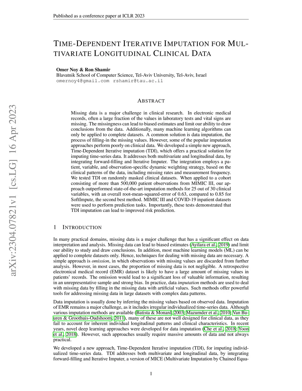 Missing data is a major challenge in clinical research. In electronic medical records, often a large fraction of the values in laboratory tests and vital signs are missing. The missingness can lead to biased estimates and limit our ability to draw conclusions from the data. Additionally, many machine learning algorithms can only be applied to complete datasets. A common solution is data imputation, the process of filling-in the missing values. However, some of the popular imputation approaches perform poorly on clinical data. We developed a simple new approach, Time-Dependent Iterative imputation (TDI), which offers a practical solution for imputing time-series data. It addresses both multivariate and longitudinal data, by integrating forward-filling and Iterative Imputer. The integration employs a patient, variable, and observation-specific dynamic weighting strategy, based on the clinical patterns of the data, including missing rates and measurement frequency. We tested TDI on randomly masked clinical datasets. When applied to a cohort consisting of more than 500,000 patient observations from MIMIC III, our approach outperformed state-of-the-art imputation methods for 25 out of 30 clinical variables, with an overall root-mean-squared-error of 0.63, compared to 0.85 for SoftImpute, the second best method. MIMIC III and COVID-19 inpatient datasets were used to perform prediction tasks. Importantly, these tests demonstrated that TDI imputation can lead to improved risk prediction.