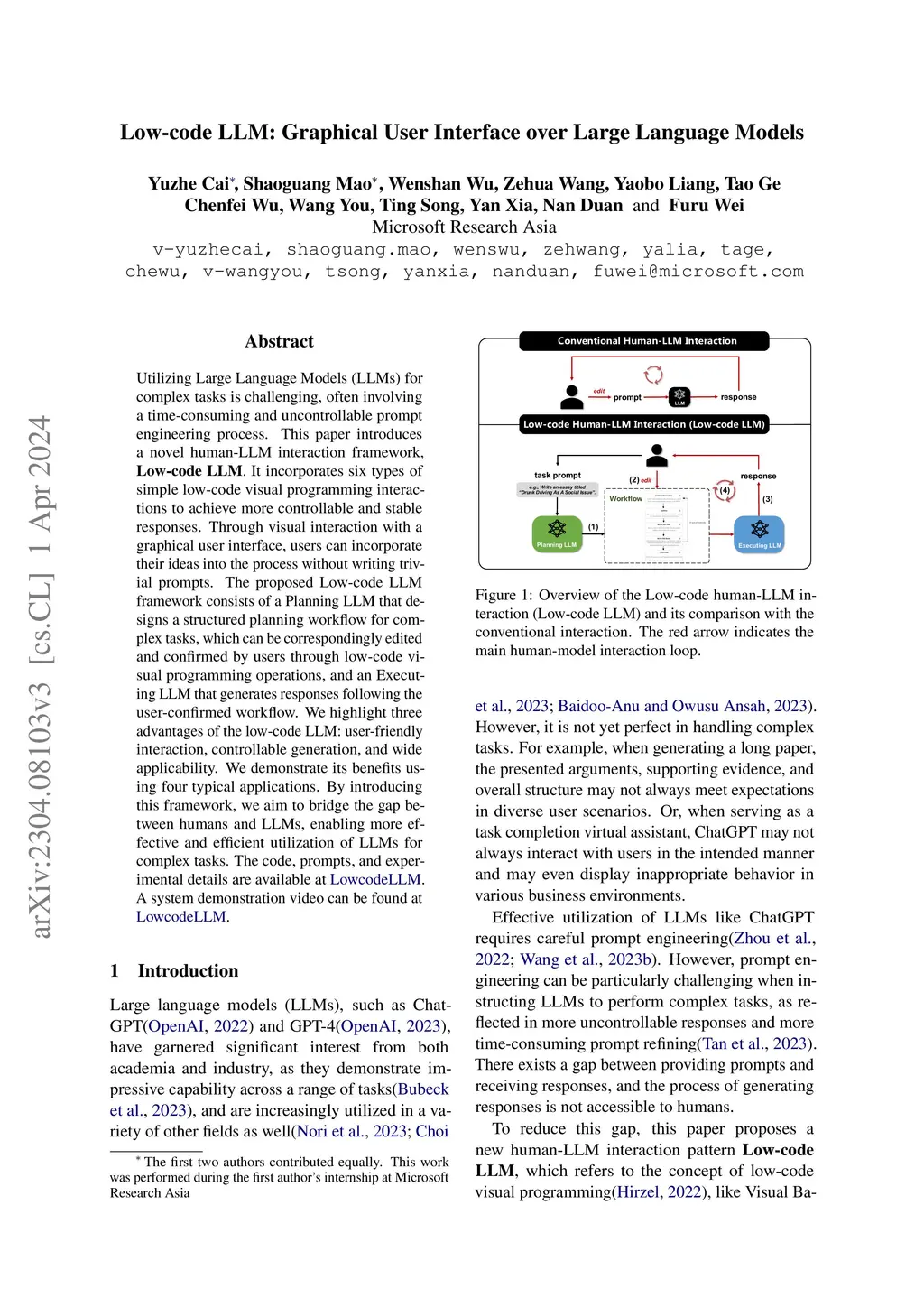 Utilizing Large Language Models (LLMs) for complex tasks is challenging, often involving a time-consuming and uncontrollable prompt engineering process. This paper introduces a novel human-LLM interaction framework, Low-code LLM. It incorporates six types of simple low-code visual programming interactions to achieve more controllable and stable responses. Through visual interaction with a graphical user interface, users can incorporate their ideas into the process without writing trivial prompts. The proposed Low-code LLM framework consists of a Planning LLM that designs a structured planning workflow for complex tasks, which can be correspondingly edited and confirmed by users through low-code visual programming operations, and an Executing LLM that generates responses following the user-confirmed workflow. We highlight three advantages of the low-code LLM: user-friendly interaction, controllable generation, and wide applicability. We demonstrate its benefits using four typical applications. By introducing this framework, we aim to bridge the gap between humans and LLMs, enabling more effective and efficient utilization of LLMs for complex tasks. The code, prompts, and experimental details are available at https://github.com/moymix/TaskMatrix/tree/main/LowCodeLLM. A system demonstration video can be found at https://www.youtube.com/watch?v=jb2C1vaeO3E.