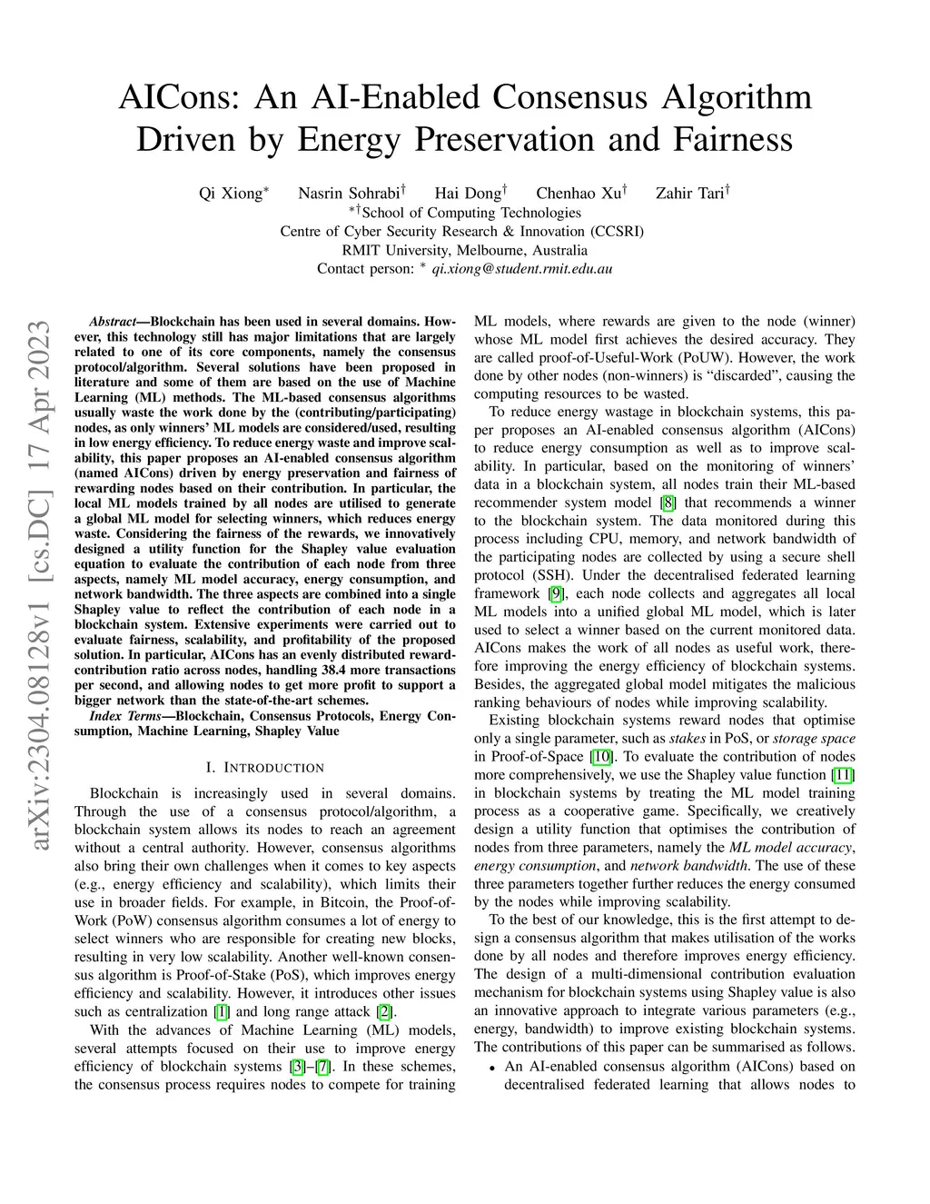 Blockchain has been used in several domains. However, this technology still has major limitations that are largely related to one of its core components, namely the consensus protocol/algorithm. Several solutions have been proposed in literature and some of them are based on the use of Machine Learning (ML) methods. The ML-based consensus algorithms usually waste the work done by the (contributing/participating) nodes, as only winners' ML models are considered/used, resulting in low energy efficiency. To reduce energy waste and improve scalability, this paper proposes an AI-enabled consensus algorithm (named AICons) driven by energy preservation and fairness of rewarding nodes based on their contribution. In particular, the local ML models trained by all nodes are utilised to generate a global ML model for selecting winners, which reduces energy waste. Considering the fairness of the rewards, we innovatively designed a utility function for the Shapley value evaluation equation to evaluate the contribution of each node from three aspects, namely ML model accuracy, energy consumption, and network bandwidth. The three aspects are combined into a single Shapley value to reflect the contribution of each node in a blockchain system. Extensive experiments were carried out to evaluate fairness, scalability, and profitability of the proposed solution. In particular, AICons has an evenly distributed reward-contribution ratio across nodes, handling 38.4 more transactions per second, and allowing nodes to get more profit to support a bigger network than the state-of-the-art schemes.