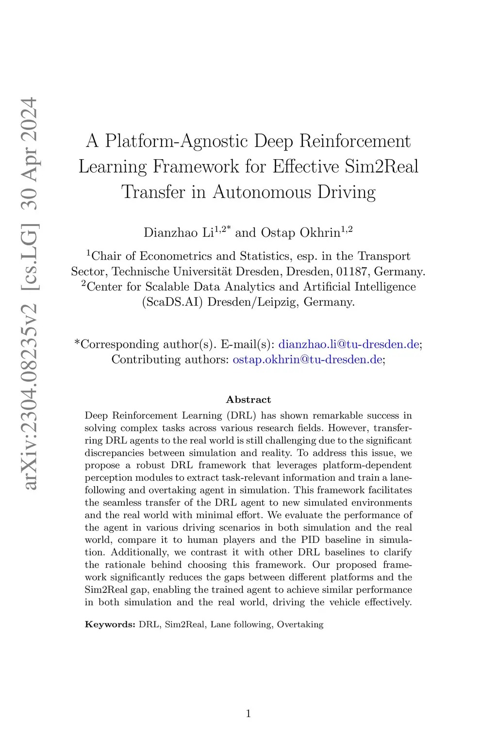 Deep Reinforcement Learning (DRL) has shown remarkable success in solving complex tasks across various research fields. However, transferring DRL agents to the real world is still challenging due to the significant discrepancies between simulation and reality. To address this issue, we propose a robust DRL framework that leverages platform-dependent perception modules to extract task-relevant information and train a lane-following and overtaking agent in simulation. This framework facilitates the seamless transfer of the DRL agent to new simulated environments and the real world with minimal effort. We evaluate the performance of the agent in various driving scenarios in both simulation and the real world, and compare it to human players and the PID baseline in simulation. Our proposed framework significantly reduces the gaps between different platforms and the Sim2Real gap, enabling the trained agent to achieve similar performance in both simulation and the real world, driving the vehicle effectively.