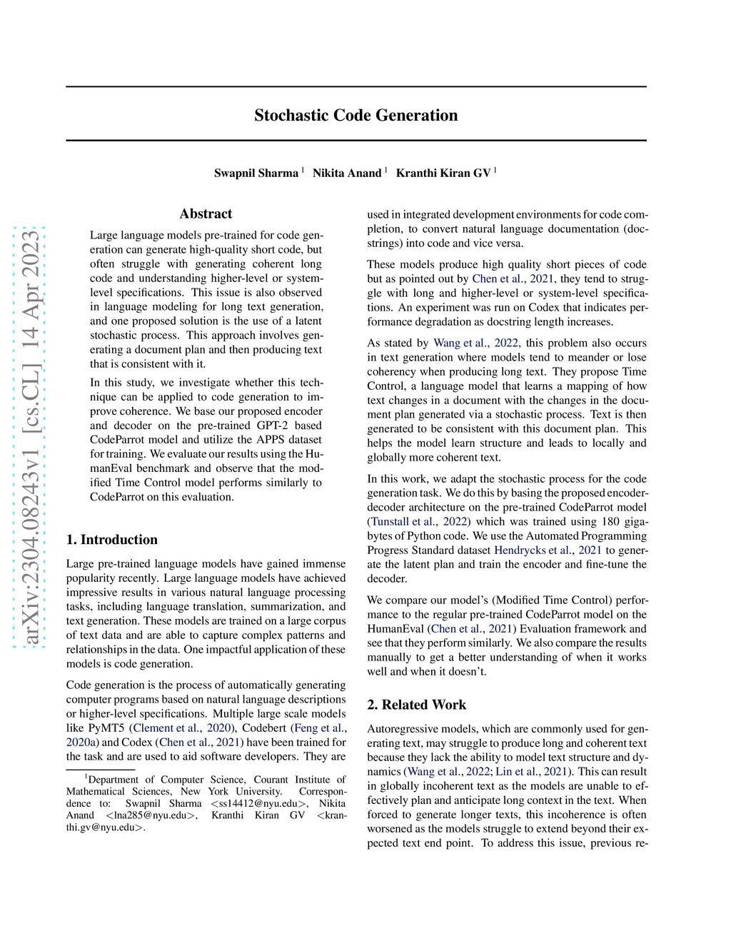 Large language models pre-trained for code generation can generate high-quality short code but often struggle with generating coherent long code and understanding higher-level or system-level specifications. This issue is also observed in language modeling for long text generation, and one proposed solution is the use of a latent stochastic process. This approach involves generating a document plan and then producing text that is consistent with it. In this study, we investigate whether this technique can be applied to code generation to improve coherence. We base our proposed encoder and decoder on the pre-trained GPT-2 based CodeParrot model and utilize the APPS dataset for training. We evaluate our results using the HumanEval benchmark and observe that the modified Time Control model performs similarly to CodeParrot on this evaluation.