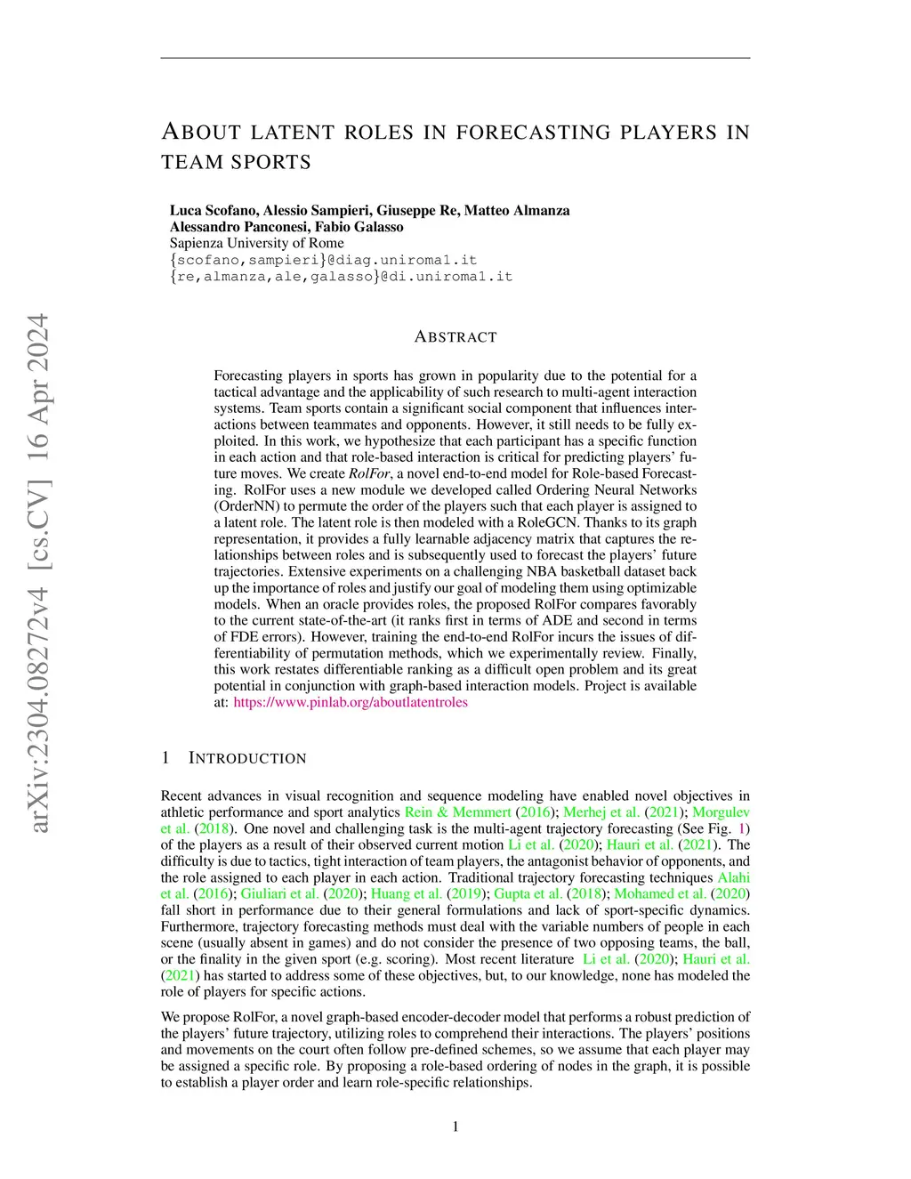 Forecasting players in sports has grown in popularity due to the potential for a tactical advantage and the applicability of such research to multi-agent interaction systems. Team sports contain a significant social component that influences interactions between teammates and opponents. However, it still needs to be fully exploited. In this work, we hypothesize that each participant has a specific function in each action and that role-based interaction is critical for predicting players' future moves. We create RolFor, a novel end-to-end model for Role-based Forecasting. RolFor uses a new module we developed called Ordering Neural Networks (OrderNN) to permute the order of the players such that each player is assigned to a latent role. The latent role is then modeled with a RoleGCN. Thanks to its graph representation, it provides a fully learnable adjacency matrix that captures the relationships between roles and is subsequently used to forecast the players' future trajectories. Extensive experiments on a challenging NBA basketball dataset back up the importance of roles and justify our goal of modeling them using optimizable models. When an oracle provides roles, the proposed RolFor compares favorably to the current state-of-the-art (it ranks first in terms of ADE and second in terms of FDE errors). However, training the end-to-end RolFor incurs the issues of differentiability of permutation methods, which we experimentally review. Finally, this work restates differentiable ranking as a difficult open problem and its great potential in conjunction with graph-based interaction models. Project is available at: https://www.pinlab.org/aboutlatentroles