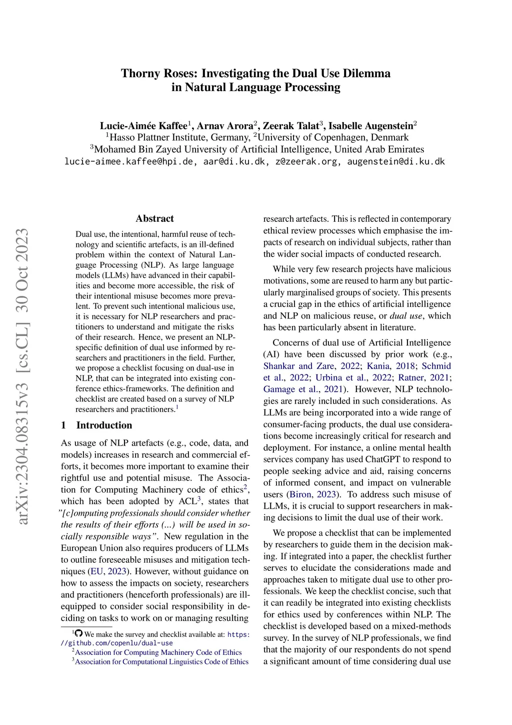 Dual use, the intentional, harmful reuse of technology and scientific artefacts, is a problem yet to be well-defined within the context of Natural Language Processing (NLP). However, as NLP technologies continue to advance and become increasingly widespread in society, their inner workings have become increasingly opaque. Therefore, understanding dual use concerns and potential ways of limiting them is critical to minimising the potential harms of research and development. In this paper, we conduct a survey of NLP researchers and practitioners to understand the depth and their perspective of the problem as well as to assess existing available support. Based on the results of our survey, we offer a definition of dual use that is tailored to the needs of the NLP community. The survey revealed that a majority of researchers are concerned about the potential dual use of their research but only take limited action toward it. In light of the survey results, we discuss the current state and potential means for mitigating dual use in NLP and propose a checklist that can be integrated into existing conference ethics-frameworks, e.g., the ACL ethics checklist.
