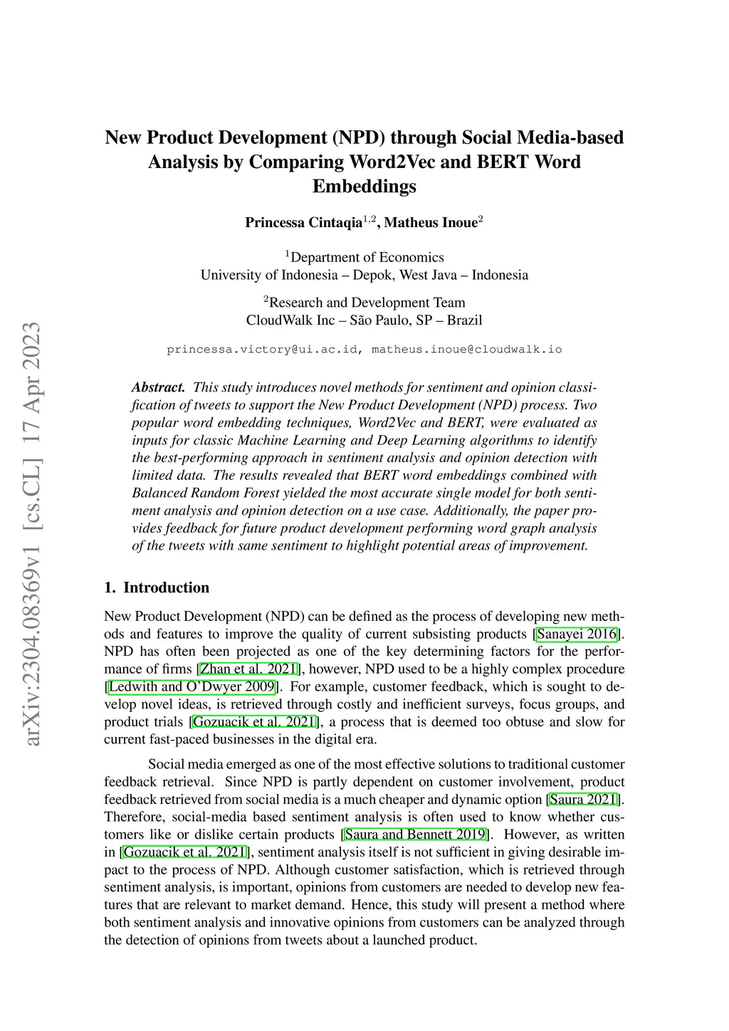 This study introduces novel methods for sentiment and opinion classification of tweets to support the New Product Development (NPD) process. Two popular word embedding techniques, Word2Vec and BERT, were evaluated as inputs for classic Machine Learning and Deep Learning algorithms to identify the best-performing approach in sentiment analysis and opinion detection with limited data. The results revealed that BERT word embeddings combined with Balanced Random Forest yielded the most accurate single model for both sentiment analysis and opinion detection on a use case. Additionally, the paper provides feedback for future product development performing word graph analysis of the tweets with same sentiment to highlight potential areas of improvement.
