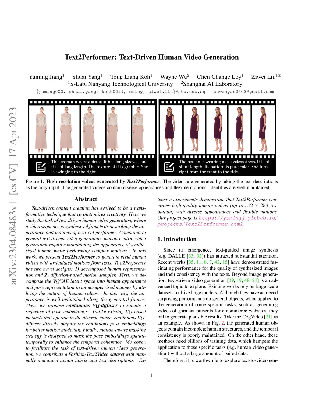 Text-driven content creation has evolved to be a transformative technique that revolutionizes creativity. Here we study the task of text-driven human video generation, where a video sequence is synthesized from texts describing the appearance and motions of a target performer. Compared to general text-driven video generation, human-centric video generation requires maintaining the appearance of synthesized human while performing complex motions. In this work, we present Text2Performer to generate vivid human videos with articulated motions from texts. Text2Performer has two novel designs: 1) decomposed human representation and 2) diffusion-based motion sampler. First, we decompose the VQVAE latent space into human appearance and pose representation in an unsupervised manner by utilizing the nature of human videos. In this way, the appearance is well maintained along the generated frames. Then, we propose continuous VQ-diffuser to sample a sequence of pose embeddings. Unlike existing VQ-based methods that operate in the discrete space, continuous VQ-diffuser directly outputs the continuous pose embeddings for better motion modeling. Finally, motion-aware masking strategy is designed to mask the pose embeddings spatial-temporally to enhance the temporal coherence. Moreover, to facilitate the task of text-driven human video generation, we contribute a Fashion-Text2Video dataset with manually annotated action labels and text descriptions. Extensive experiments demonstrate that Text2Performer generates high-quality human videos (up to 512x256 resolution) with diverse appearances and flexible motions.