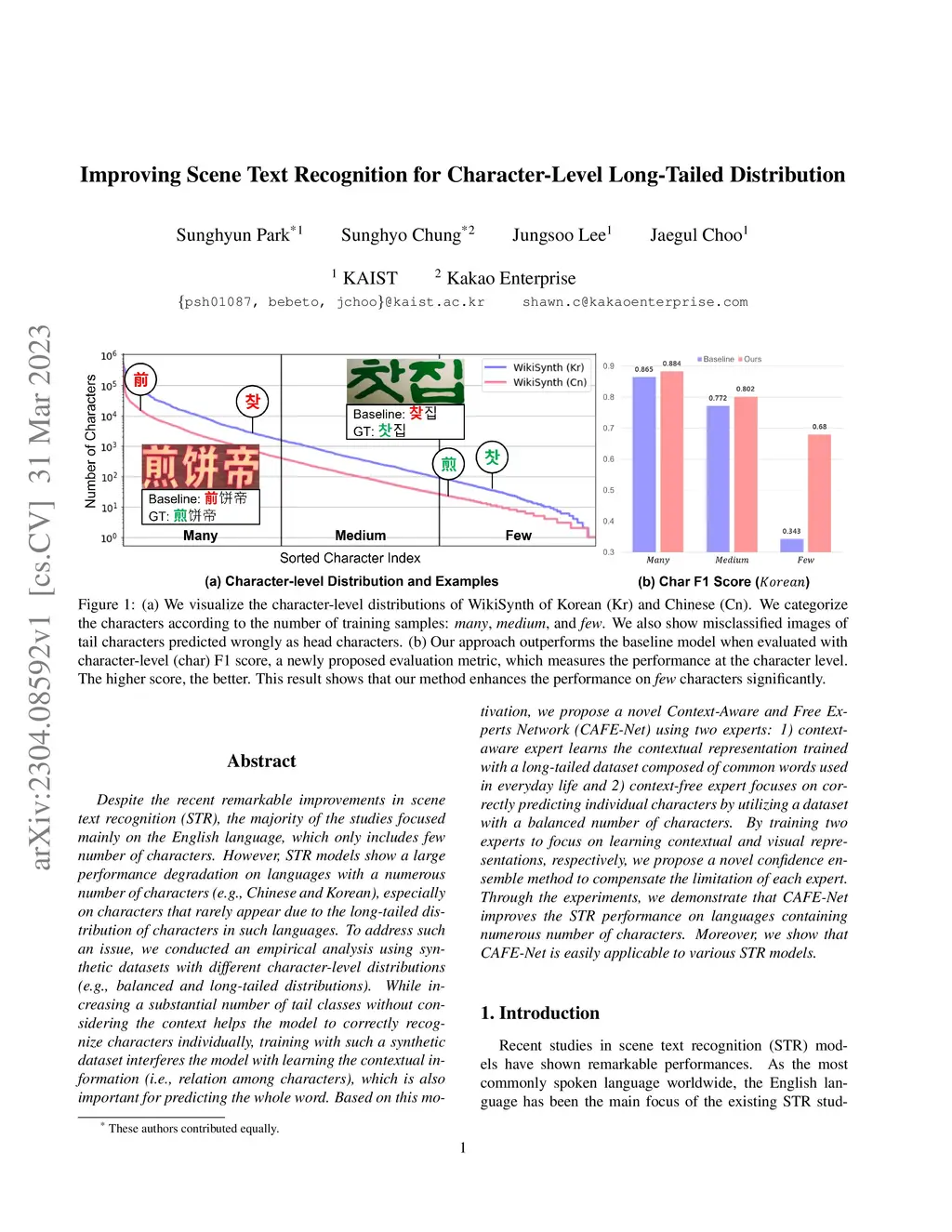 Despite the recent remarkable improvements in scene text recognition (STR), the majority of the studies focused mainly on the English language, which only includes few number of characters. However, STR models show a large performance degradation on languages with a numerous number of characters (e.g., Chinese and Korean), especially on characters that rarely appear due to the long-tailed distribution of characters in such languages. To address such an issue, we conducted an empirical analysis using synthetic datasets with different character-level distributions (e.g., balanced and long-tailed distributions). While increasing a substantial number of tail classes without considering the context helps the model to correctly recognize characters individually, training with such a synthetic dataset interferes the model with learning the contextual information (i.e., relation among characters), which is also important for predicting the whole word. Based on this motivation, we propose a novel Context-Aware and Free Experts Network (CAFE-Net) using two experts: 1) context-aware expert learns the contextual representation trained with a long-tailed dataset composed of common words used in everyday life and 2) context-free expert focuses on correctly predicting individual characters by utilizing a dataset with a balanced number of characters. By training two experts to focus on learning contextual and visual representations, respectively, we propose a novel confidence ensemble method to compensate the limitation of each expert. Through the experiments, we demonstrate that CAFE-Net improves the STR performance on languages containing numerous number of characters. Moreover, we show that CAFE-Net is easily applicable to various STR models.