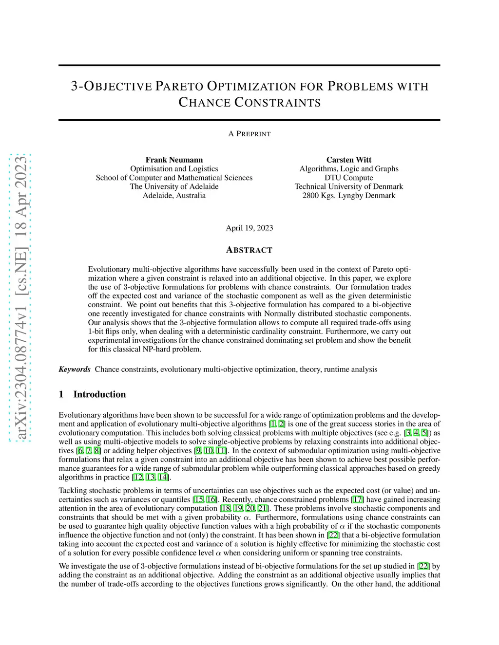 3-Objective Pareto Optimization for Problems with Chance Constraints