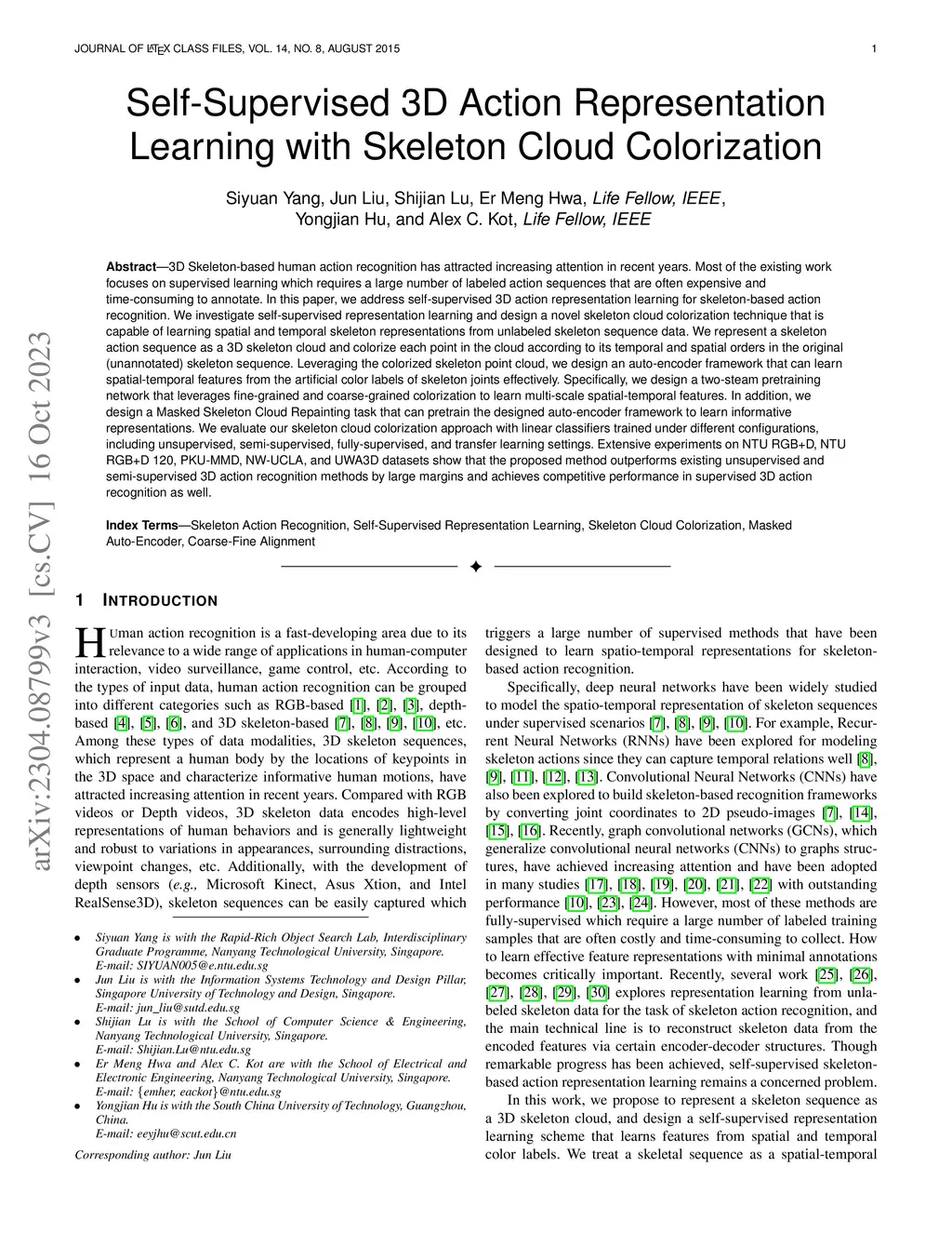 3D Skeleton-based human action recognition has attracted increasing attention in recent years. Most of the existing work focuses on supervised learning which requires a large number of labeled action sequences that are often expensive and time-consuming to annotate. In this paper, we address self-supervised 3D action representation learning for skeleton-based action recognition. We investigate self-supervised representation learning and design a novel skeleton cloud colorization technique that is capable of learning spatial and temporal skeleton representations from unlabeled skeleton sequence data. We represent a skeleton action sequence as a 3D skeleton cloud and colorize each point in the cloud according to its temporal and spatial orders in the original (unannotated) skeleton sequence. Leveraging the colorized skeleton point cloud, we design an auto-encoder framework that can learn spatial-temporal features from the artificial color labels of skeleton joints effectively. Specifically, we design a two-steam pretraining network that leverages fine-grained and coarse-grained colorization to learn multi-scale spatial-temporal features. In addition, we design a Masked Skeleton Cloud Repainting task that can pretrain the designed auto-encoder framework to learn informative representations. We evaluate our skeleton cloud colorization approach with linear classifiers trained under different configurations, including unsupervised, semi-supervised, fully-supervised, and transfer learning settings. Extensive experiments on NTU RGB+D, NTU RGB+D 120, PKU-MMD, NW-UCLA, and UWA3D datasets show that the proposed method outperforms existing unsupervised and semi-supervised 3D action recognition methods by large margins and achieves competitive performance in supervised 3D action recognition as well.