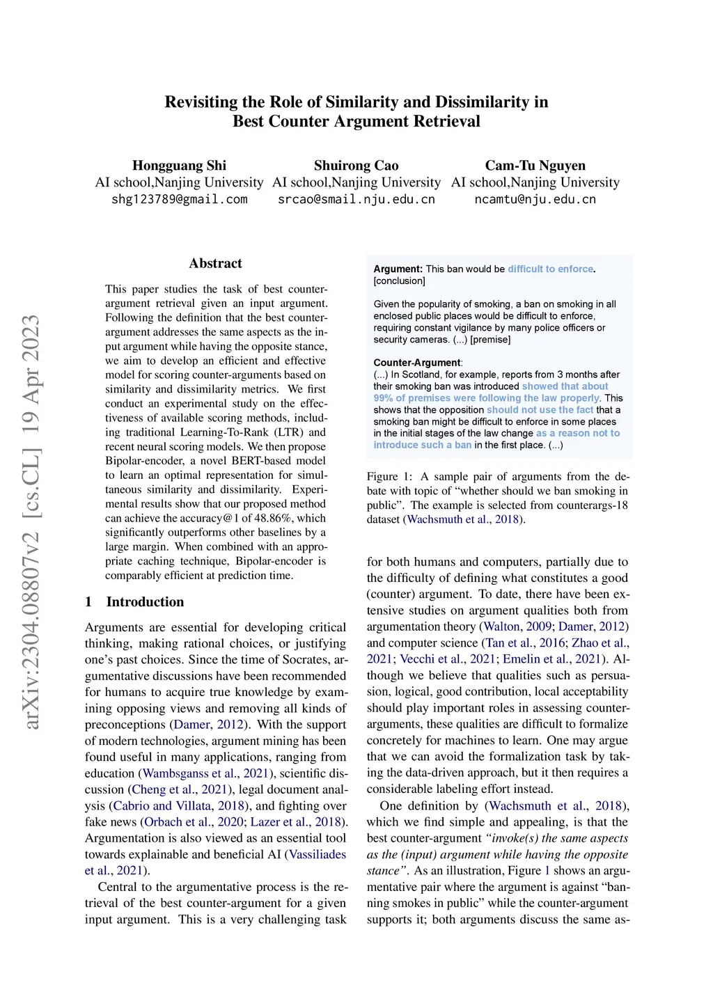 This paper studies the task of best counter-argument retrieval given an input argument. Following the definition that the best counter-argument addresses the same aspects as the input argument while having the opposite stance, we aim to develop an efficient and effective model for scoring counter-arguments based on similarity and dissimilarity metrics. We first conduct an experimental study on the effectiveness of available scoring methods, including traditional Learning-To-Rank (LTR) and recent neural scoring models. We then propose Bipolar-encoder, a novel BERT-based model to learn an optimal representation for simultaneous similarity and dissimilarity. Experimental results show that our proposed method can achieve the accuracy@1 of 49.04\%, which significantly outperforms other baselines by a large margin. When combined with an appropriate caching technique, Bipolar-encoder is comparably efficient at prediction time.