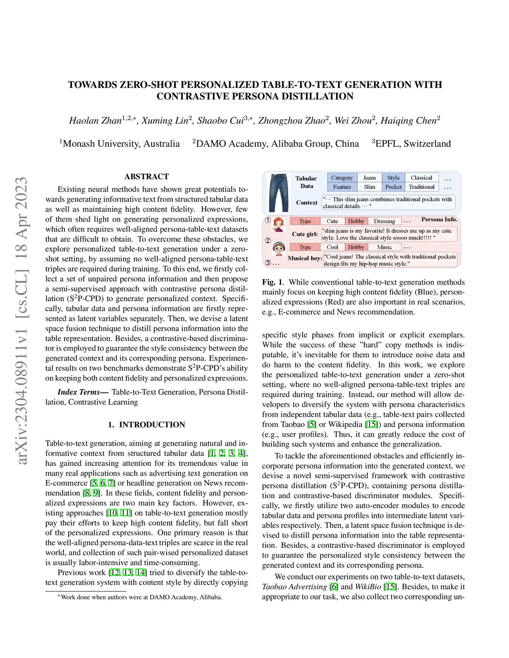 Existing neural methods have shown great potentials towards generating informative text from structured tabular data as well as maintaining high content fidelity. However, few of them shed light on generating personalized expressions, which often requires well-aligned persona-table-text datasets that are difficult to obtain. To overcome these obstacles, we explore personalized table-to-text generation under a zero-shot setting, by assuming no well-aligned persona-table-text triples are required during training. To this end, we firstly collect a set of unpaired persona information and then propose a semi-supervised approach with contrastive persona distillation (S2P-CPD) to generate personalized context. Specifically, tabular data and persona information are firstly represented as latent variables separately. Then, we devise a latent space fusion technique to distill persona information into the table representation. Besides, a contrastive-based discriminator is employed to guarantee the style consistency between the generated context and its corresponding persona. Experimental results on two benchmarks demonstrate S2P-CPD's ability on keeping both content fidelity and personalized expressions.