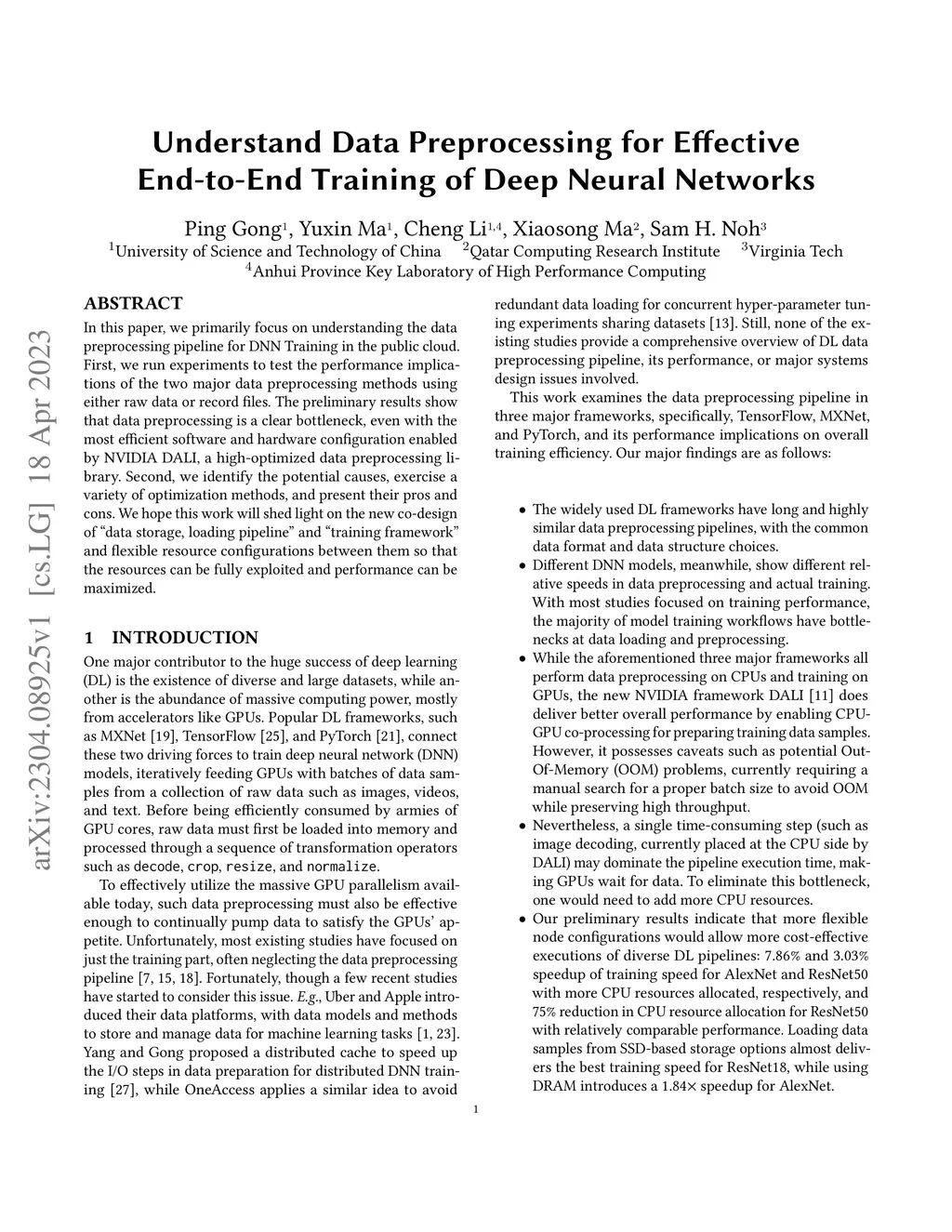 In this paper, we primarily focus on understanding the data preprocessing pipeline for DNN Training in the public cloud. First, we run experiments to test the performance implications of the two major data preprocessing methods using either raw data or record files. The preliminary results show that data preprocessing is a clear bottleneck, even with the most efficient software and hardware configuration enabled by NVIDIA DALI, a high-optimized data preprocessing library. Second, we identify the potential causes, exercise a variety of optimization methods, and present their pros and cons. We hope this work will shed light on the new co-design of ``data storage, loading pipeline'' and ``training framework'' and flexible resource configurations between them so that the resources can be fully exploited and performance can be maximized.