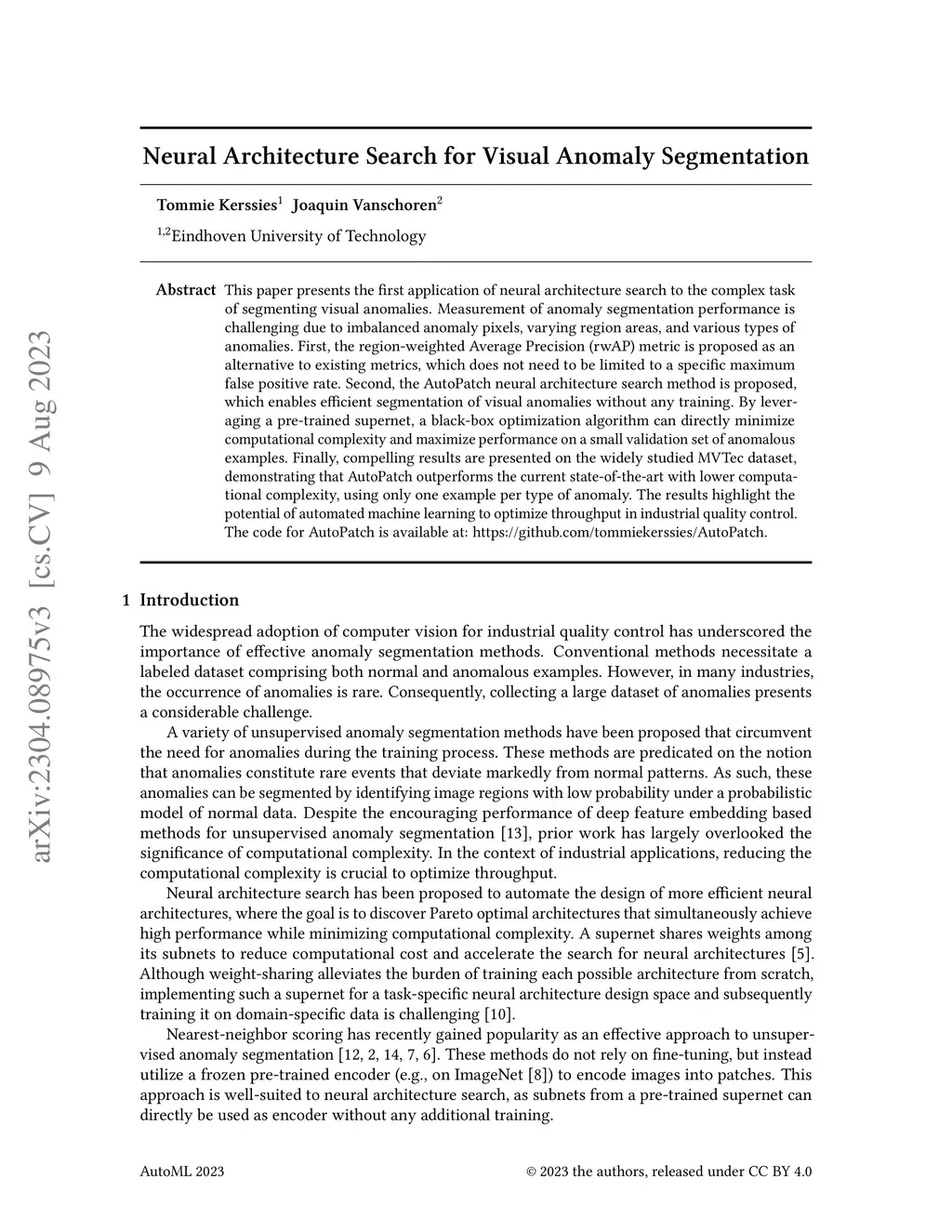 This paper presents the first application of neural architecture search to the complex task of segmenting visual anomalies. Measurement of anomaly segmentation performance is challenging due to imbalanced anomaly pixels, varying region areas, and various types of anomalies. First, the region-weighted Average Precision (rwAP) metric is proposed as an alternative to existing metrics, which does not need to be limited to a specific maximum false positive rate. Second, the AutoPatch neural architecture search method is proposed, which enables efficient segmentation of visual anomalies without any training. By leveraging a pre-trained supernet, a black-box optimization algorithm can directly minimize computational complexity and maximize performance on a small validation set of anomalous examples. Finally, compelling results are presented on the widely studied MVTec dataset, demonstrating that AutoPatch outperforms the current state-of-the-art with lower computational complexity, using only one example per type of anomaly. The results highlight the potential of automated machine learning to optimize throughput in industrial quality control. The code for AutoPatch is available at: https://github.com/tommiekerssies/AutoPatch