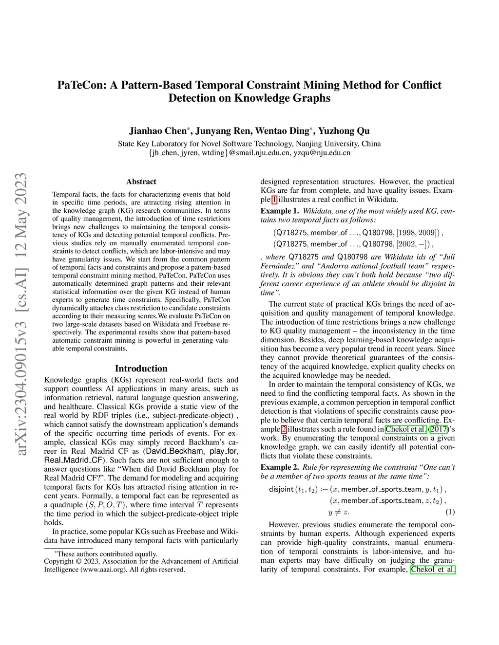 PaTeCon: A Pattern-Based Temporal Constraint Mining Method for Conflict Detection on Knowledge Graphs