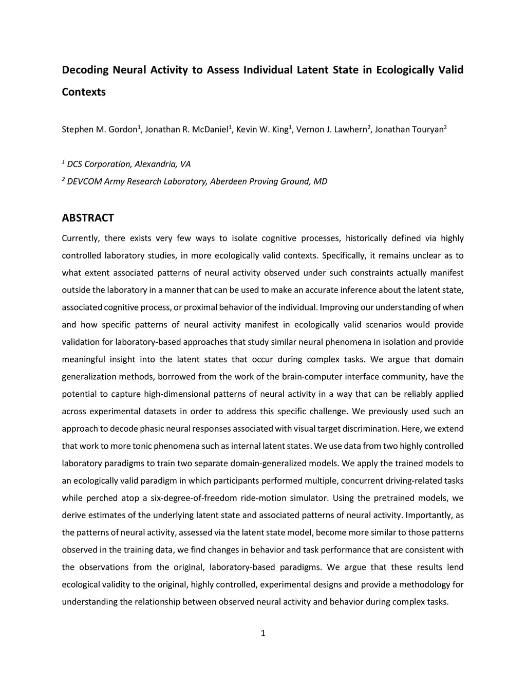 There exist very few ways to isolate cognitive processes, historically defined via highly controlled laboratory studies, in more ecologically valid contexts. Specifically, it remains unclear as to what extent patterns of neural activity observed under such constraints actually manifest outside the laboratory in a manner that can be used to make an accurate inference about the latent state, associated cognitive process, or proximal behavior of the individual. Improving our understanding of when and how specific patterns of neural activity manifest in ecologically valid scenarios would provide validation for laboratory-based approaches that study similar neural phenomena in isolation and meaningful insight into the latent states that occur during complex tasks. We argue that domain generalization methods from the brain-computer interface community have the potential to address this challenge. We previously used such an approach to decode phasic neural responses associated with visual target discrimination. Here, we extend that work to more tonic phenomena such as internal latent states. We use data from two highly controlled laboratory paradigms to train two separate domain-generalized models. We apply the trained models to an ecologically valid paradigm in which participants performed multiple, concurrent driving-related tasks. Using the pretrained models, we derive estimates of the underlying latent state and associated patterns of neural activity. Importantly, as the patterns of neural activity change along the axis defined by the original training data, we find changes in behavior and task performance consistent with the observations from the original, laboratory paradigms. We argue that these results lend ecological validity to those experimental designs and provide a methodology for understanding the relationship between observed neural activity and behavior during complex tasks.