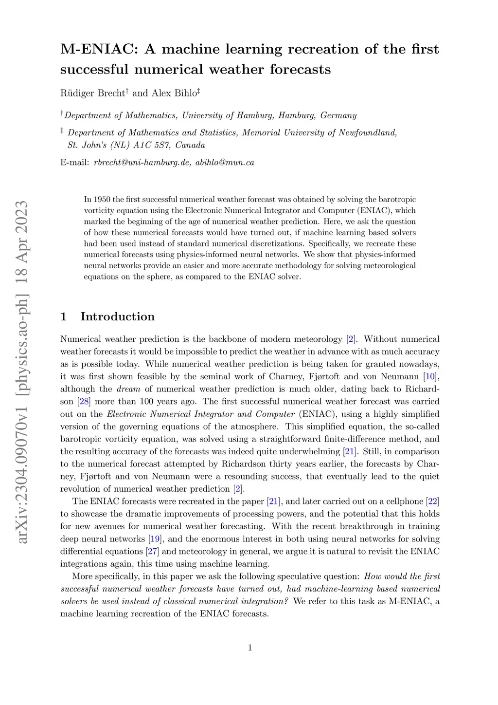 In 1950 the first successful numerical weather forecast was obtained by solving the barotropic vorticity equation using the Electronic Numerical Integrator and Computer (ENIAC), which marked the beginning of the age of numerical weather prediction. Here, we ask the question of how these numerical forecasts would have turned out, if machine learning based solvers had been used instead of standard numerical discretizations. Specifically, we recreate these numerical forecasts using physics-informed neural networks. We show that physics-informed neural networks provide an easier and more accurate methodology for solving meteorological equations on the sphere, as compared to the ENIAC solver.
