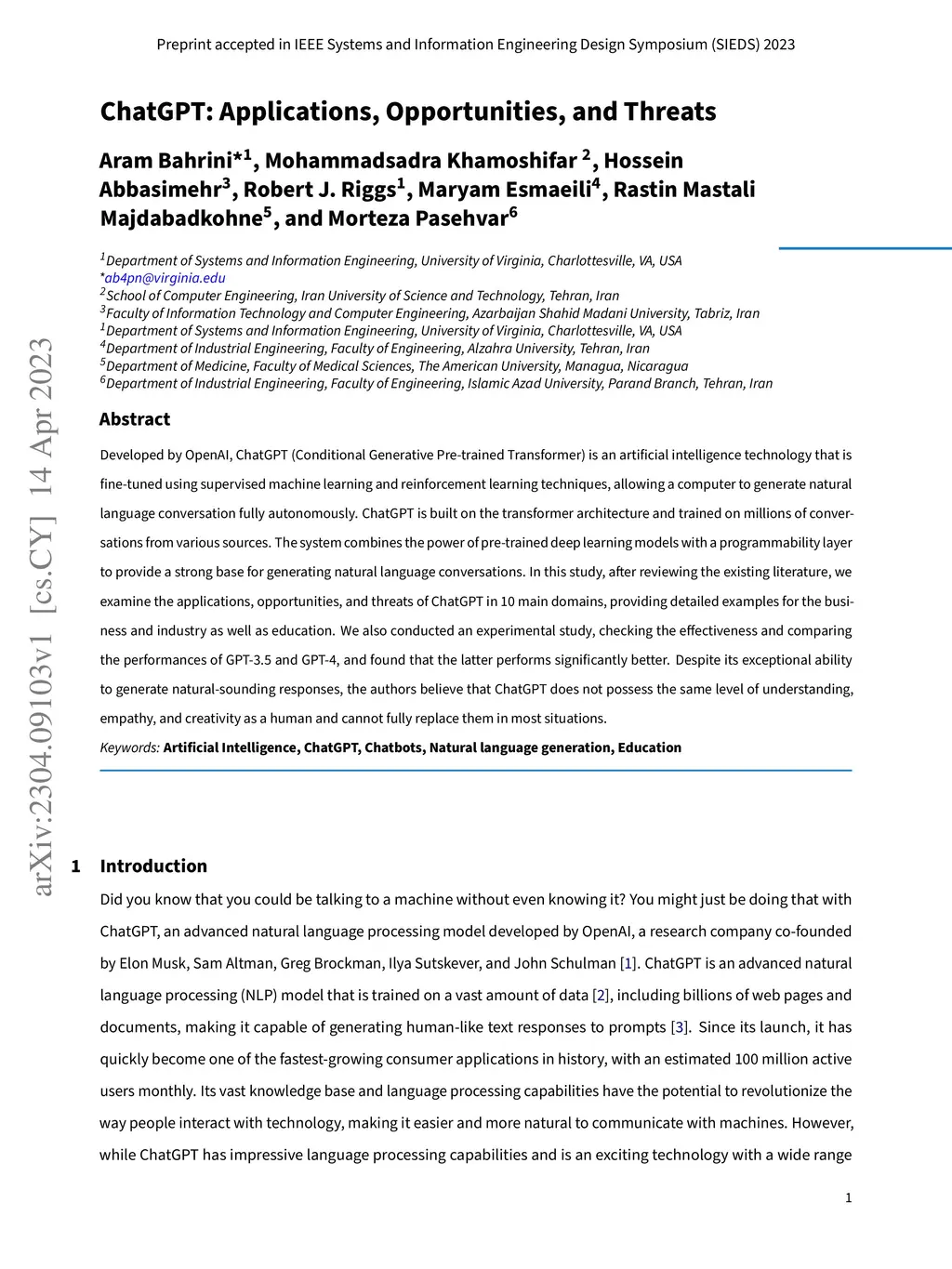 Developed by OpenAI, ChatGPT (Conditional Generative Pre-trained Transformer) is an artificial intelligence technology that is fine-tuned using supervised machine learning and reinforcement learning techniques, allowing a computer to generate natural language conversation fully autonomously. ChatGPT is built on the transformer architecture and trained on millions of conversations from various sources. The system combines the power of pre-trained deep learning models with a programmability layer to provide a strong base for generating natural language conversations. In this study, after reviewing the existing literature, we examine the applications, opportunities, and threats of ChatGPT in 10 main domains, providing detailed examples for the business and industry as well as education. We also conducted an experimental study, checking the effectiveness and comparing the performances of GPT-3.5 and GPT-4, and found that the latter performs significantly better. Despite its exceptional ability to generate natural-sounding responses, the authors believe that ChatGPT does not possess the same level of understanding, empathy, and creativity as a human and cannot fully replace them in most situations.
