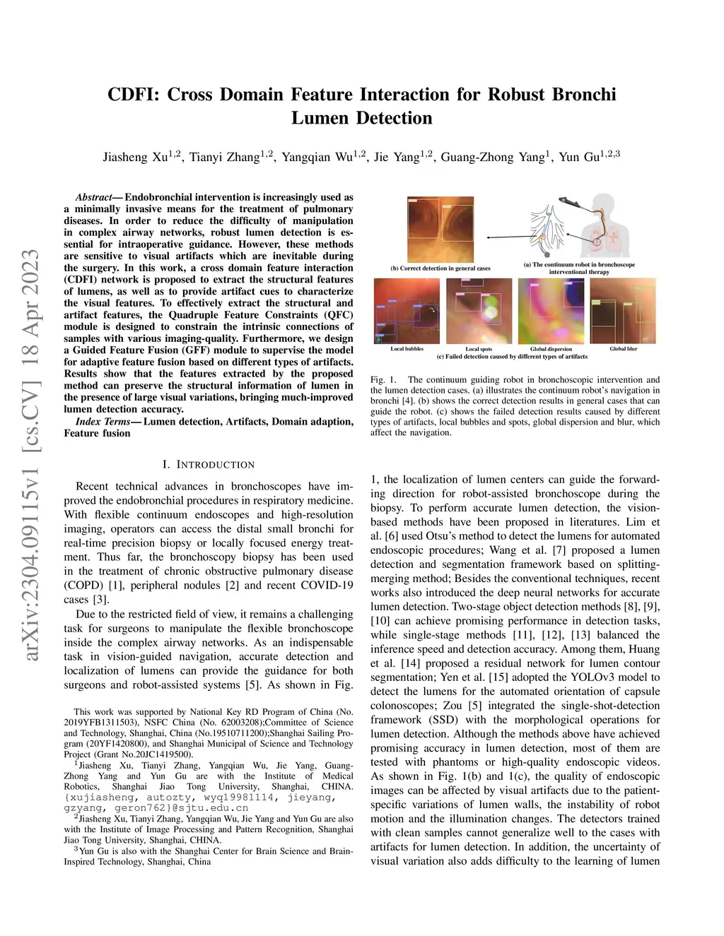 Endobronchial intervention is increasingly used as a minimally invasive means for the treatment of pulmonary diseases. In order to reduce the difficulty of manipulation in complex airway networks, robust lumen detection is essential for intraoperative guidance. However, these methods are sensitive to visual artifacts which are inevitable during the surgery. In this work, a cross domain feature interaction (CDFI) network is proposed to extract the structural features of lumens, as well as to provide artifact cues to characterize the visual features. To effectively extract the structural and artifact features, the Quadruple Feature Constraints (QFC) module is designed to constrain the intrinsic connections of samples with various imaging-quality. Furthermore, we design a Guided Feature Fusion (GFF) module to supervise the model for adaptive feature fusion based on different types of artifacts. Results show that the features extracted by the proposed method can preserve the structural information of lumen in the presence of large visual variations, bringing much-improved lumen detection accuracy.