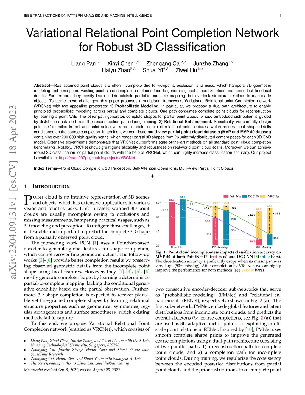 Real-scanned point clouds are often incomplete due to viewpoint, occlusion, and noise, which hampers 3D geometric modeling and perception. Existing point cloud completion methods tend to generate global shape skeletons and hence lack fine local details. Furthermore, they mostly learn a deterministic partial-to-complete mapping, but overlook structural relations in man-made objects. To tackle these challenges, this paper proposes a variational framework, Variational Relational point Completion Network (VRCNet) with two appealing properties: 1) Probabilistic Modeling. In particular, we propose a dual-path architecture to enable principled probabilistic modeling across partial and complete clouds. One path consumes complete point clouds for reconstruction by learning a point VAE. The other path generates complete shapes for partial point clouds, whose embedded distribution is guided by distribution obtained from the reconstruction path during training. 2) Relational Enhancement. Specifically, we carefully design point self-attention kernel and point selective kernel module to exploit relational point features, which refines local shape details conditioned on the coarse completion. In addition, we contribute multi-view partial point cloud datasets (MVP and MVP-40 dataset) containing over 200,000 high-quality scans, which render partial 3D shapes from 26 uniformly distributed camera poses for each 3D CAD model. Extensive experiments demonstrate that VRCNet outperforms state-of-the-art methods on all standard point cloud completion benchmarks. Notably, VRCNet shows great generalizability and robustness on real-world point cloud scans. Moreover, we can achieve robust 3D classification for partial point clouds with the help of VRCNet, which can highly increase classification accuracy.