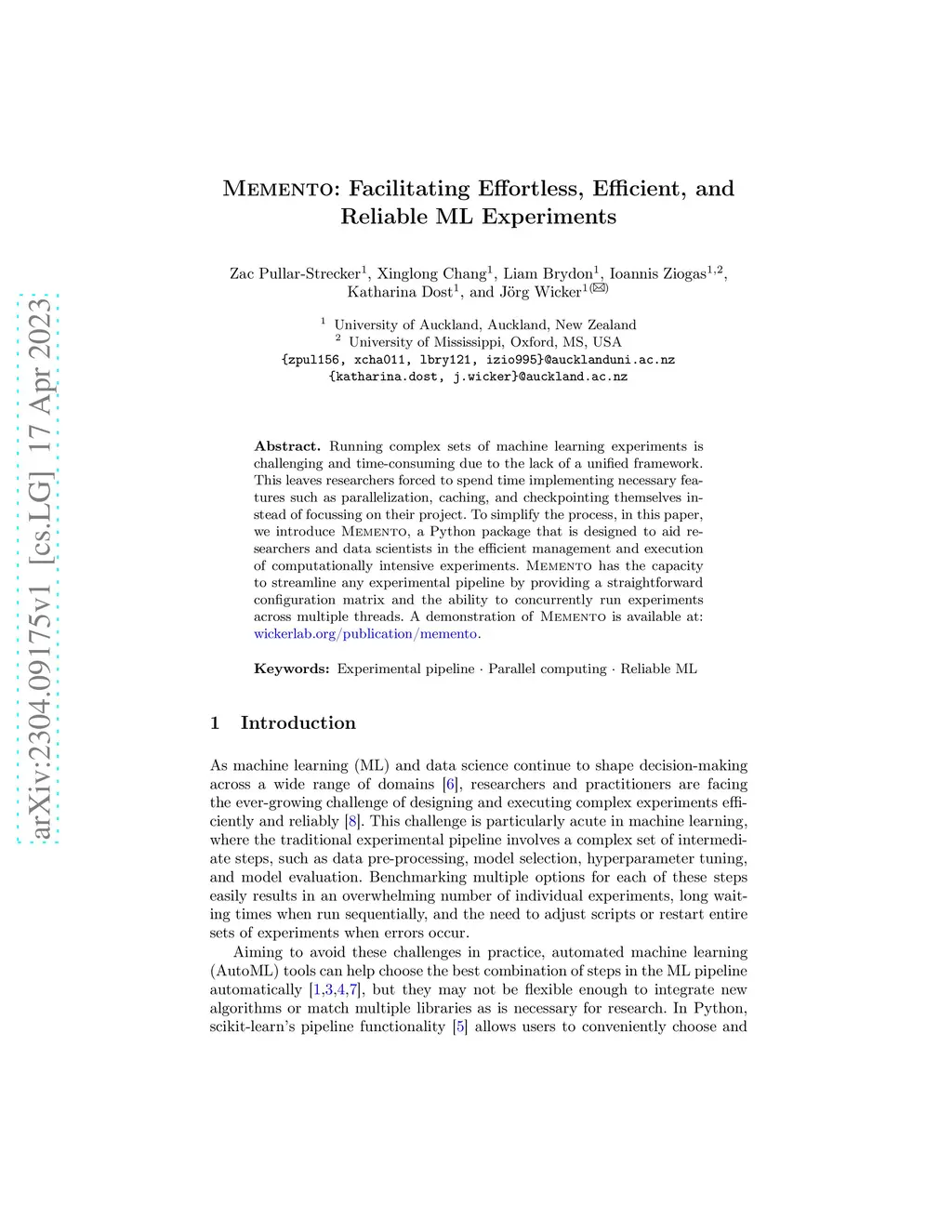 Running complex sets of machine learning experiments is challenging and time-consuming due to the lack of a unified framework. This leaves researchers forced to spend time implementing necessary features such as parallelization, caching, and checkpointing themselves instead of focussing on their project. To simplify the process, in this paper, we introduce Memento, a Python package that is designed to aid researchers and data scientists in the efficient management and execution of computationally intensive experiments. Memento has the capacity to streamline any experimental pipeline by providing a straightforward configuration matrix and the ability to concurrently run experiments across multiple threads. A demonstration of Memento is available at: https://wickerlab.org/publication/memento.