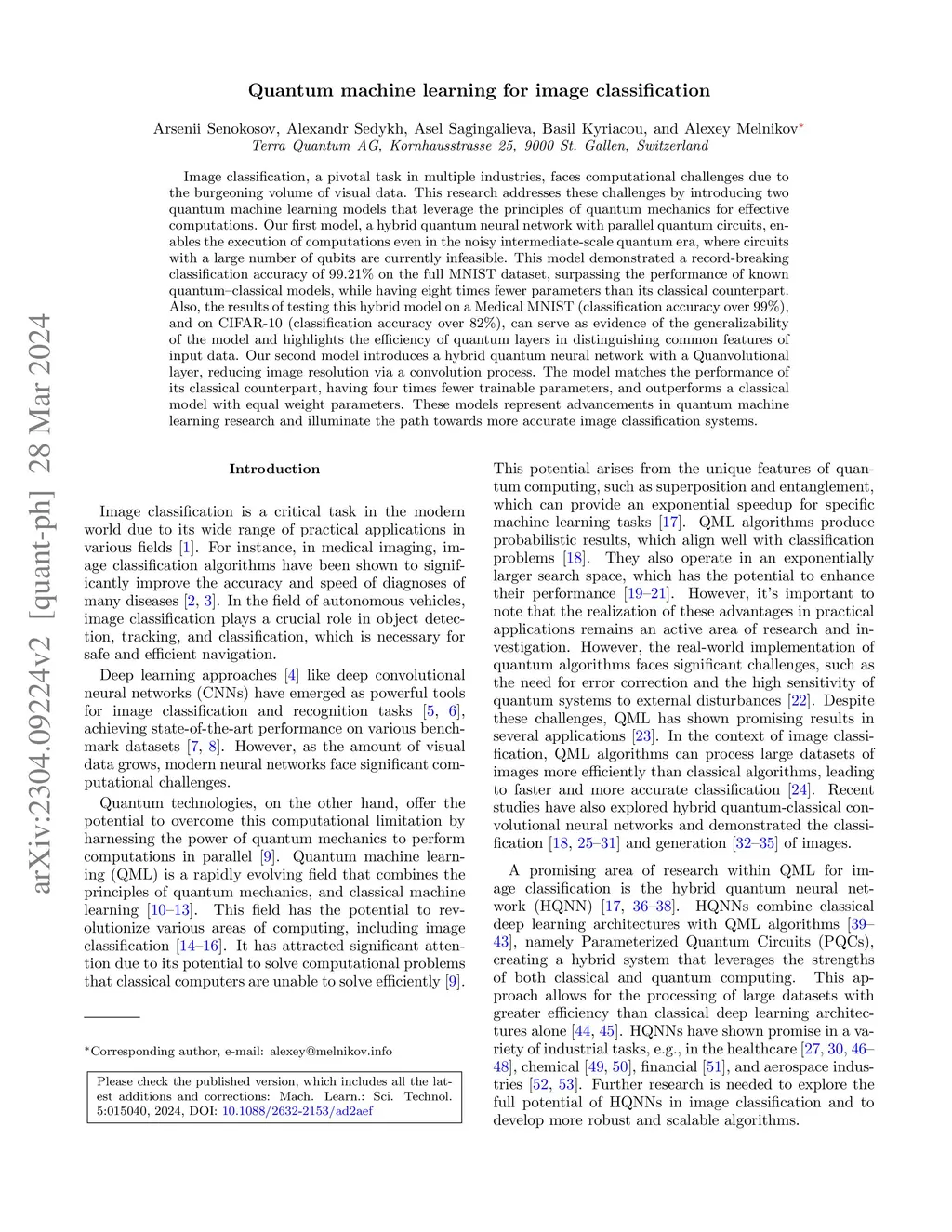 Image classification, a pivotal task in multiple industries, faces computational challenges due to the burgeoning volume of visual data. This research addresses these challenges by introducing two quantum machine learning models that leverage the principles of quantum mechanics for effective computations. Our first model, a hybrid quantum neural network with parallel quantum circuits, enables the execution of computations even in the noisy intermediate-scale quantum era, where circuits with a large number of qubits are currently infeasible. This model demonstrated a record-breaking classification accuracy of 99.21% on the full MNIST dataset, surpassing the performance of known quantum-classical models, while having eight times fewer parameters than its classical counterpart. Also, the results of testing this hybrid model on a Medical MNIST (classification accuracy over 99%), and on CIFAR-10 (classification accuracy over 82%), can serve as evidence of the generalizability of the model and highlights the efficiency of quantum layers in distinguishing common features of input data. Our second model introduces a hybrid quantum neural network with a Quanvolutional layer, reducing image resolution via a convolution process. The model matches the performance of its classical counterpart, having four times fewer trainable parameters, and outperforms a classical model with equal weight parameters. These models represent advancements in quantum machine learning research and illuminate the path towards more accurate image classification systems.