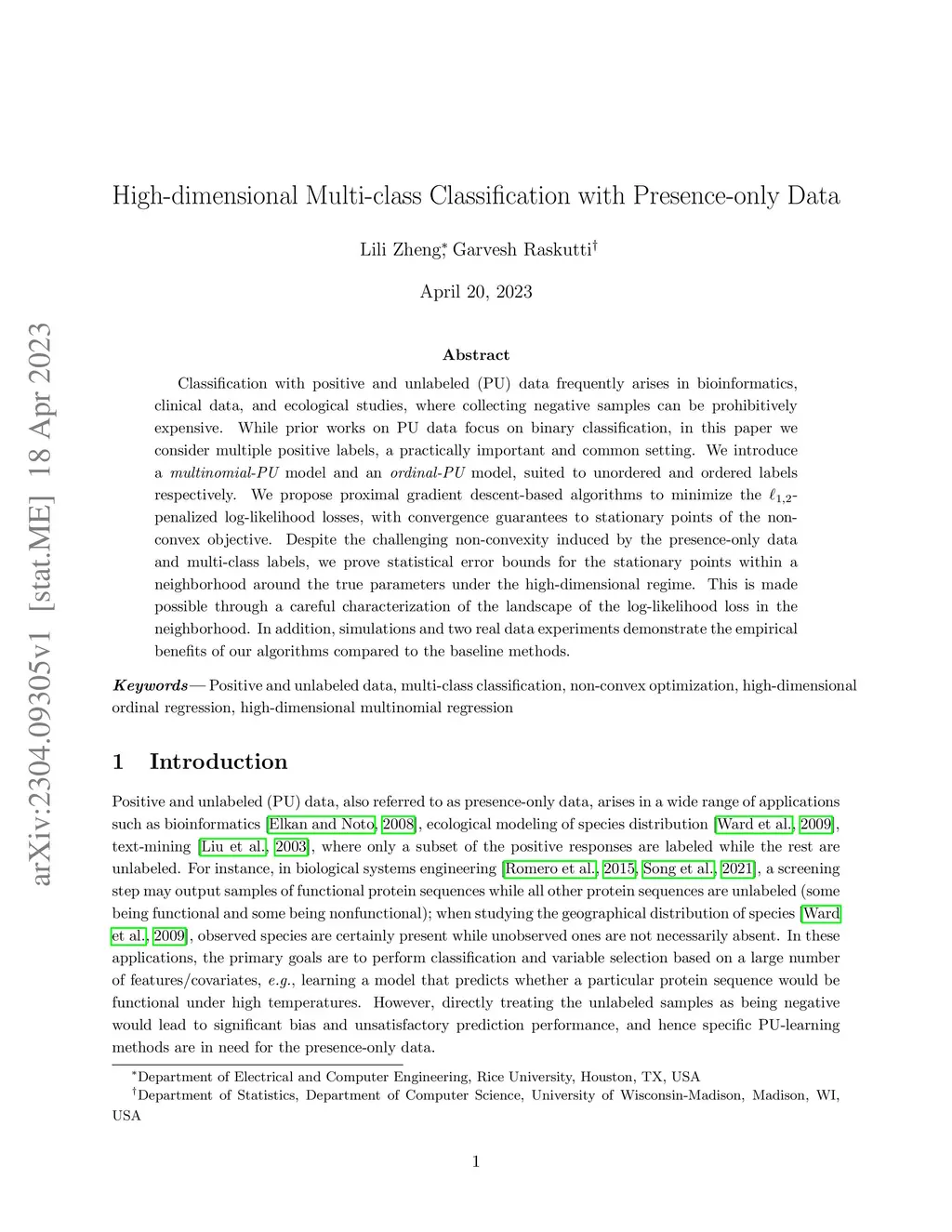 Classification with positive and unlabeled (PU) data frequently arises in bioinformatics, clinical data, and ecological studies, where collecting negative samples can be prohibitively expensive. While prior works on PU data focus on binary classification, in this paper we consider multiple positive labels, a practically important and common setting. We introduce a multinomial-PU model and an ordinal-PU model, suited to unordered and ordered labels respectively. We propose proximal gradient descent-based algorithms to minimize the l_{1,2}-penalized log-likelihood losses, with convergence guarantees to stationary points of the non-convex objective. Despite the challenging non-convexity induced by the presence-only data and multi-class labels, we prove statistical error bounds for the stationary points within a neighborhood around the true parameters under the high-dimensional regime. This is made possible through a careful characterization of the landscape of the log-likelihood loss in the neighborhood. In addition, simulations and two real data experiments demonstrate the empirical benefits of our algorithms compared to the baseline methods.