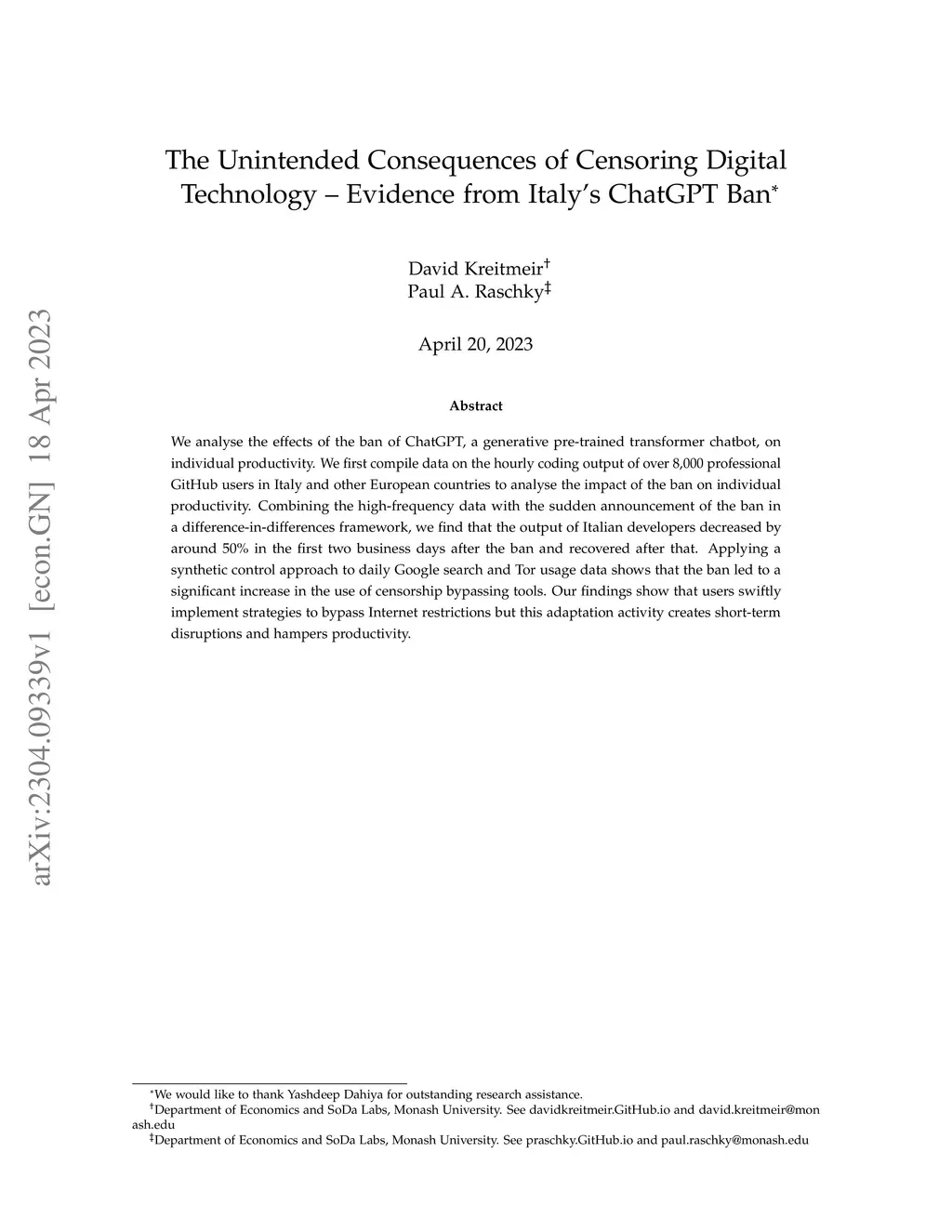We analyse the effects of the ban of ChatGPT, a generative pre-trained transformer chatbot, on individual productivity. We first compile data on the hourly coding output of over 8,000 professional GitHub users in Italy and other European countries to analyse the impact of the ban on individual productivity. Combining the high-frequency data with the sudden announcement of the ban in a difference-in-differences framework, we find that the output of Italian developers decreased by around 50% in the first two business days after the ban and recovered after that. Applying a synthetic control approach to daily Google search and Tor usage data shows that the ban led to a significant increase in the use of censorship bypassing tools. Our findings show that users swiftly implement strategies to bypass Internet restrictions but this adaptation activity creates short-term disruptions and hampers productivity.