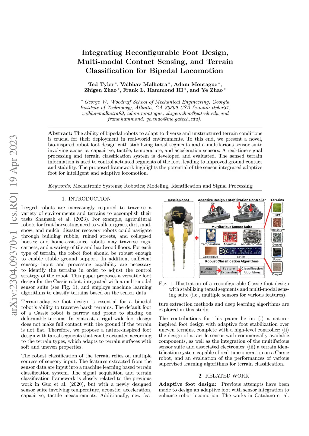 The ability of bipedal robots to adapt to diverse and unstructured terrain conditions is crucial for their deployment in real-world environments. To this end, we present a novel, bio-inspired robot foot design with stabilizing tarsal segments and a multifarious sensor suite involving acoustic, capacitive, tactile, temperature, and acceleration sensors. A real-time signal processing and terrain classification system is developed and evaluated. The sensed terrain information is used to control actuated segments of the foot, leading to improved ground contact and stability. The proposed framework highlights the potential of the sensor-integrated adaptive foot for intelligent and adaptive locomotion.