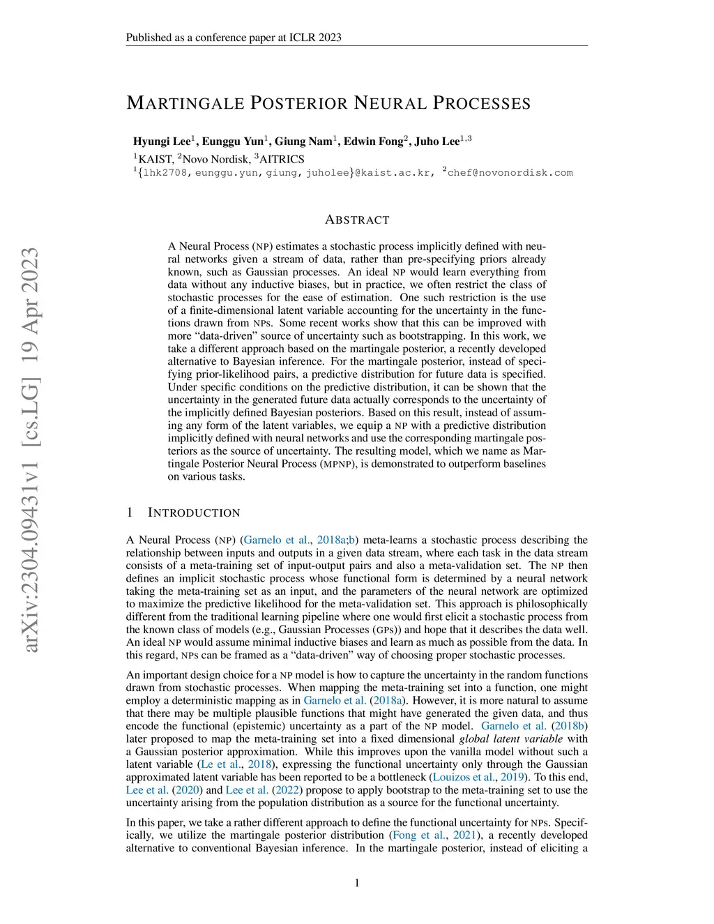 A Neural Process (NP) estimates a stochastic process implicitly defined with neural networks given a stream of data, rather than pre-specifying priors already known, such as Gaussian processes. An ideal NP would learn everything from data without any inductive biases, but in practice, we often restrict the class of stochastic processes for the ease of estimation. One such restriction is the use of a finite-dimensional latent variable accounting for the uncertainty in the functions drawn from NPs. Some recent works show that this can be improved with more "data-driven" source of uncertainty such as bootstrapping. In this work, we take a different approach based on the martingale posterior, a recently developed alternative to Bayesian inference. For the martingale posterior, instead of specifying prior-likelihood pairs, a predictive distribution for future data is specified. Under specific conditions on the predictive distribution, it can be shown that the uncertainty in the generated future data actually corresponds to the uncertainty of the implicitly defined Bayesian posteriors. Based on this result, instead of assuming any form of the latent variables, we equip a NP with a predictive distribution implicitly defined with neural networks and use the corresponding martingale posteriors as the source of uncertainty. The resulting model, which we name as Martingale Posterior Neural Process (MPNP), is demonstrated to outperform baselines on various tasks.