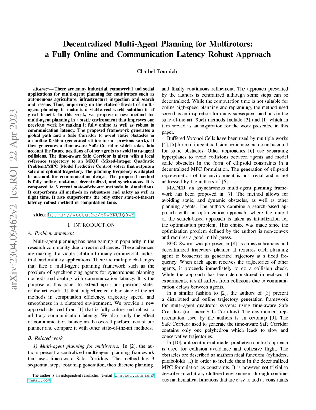 There are many industrial, commercial and social applications for multi-agent planning for multirotors such as autonomous agriculture, infrastructure inspection and search and rescue. Thus, improving on the state-of-the-art of multi-agent planning to make it a viable real-world solution is of great benefit. In this work, we propose a new method for multi-agent planning in a static environment that improves our previous work by making it fully online as well as robust to communication latency. The proposed framework generates a global path and a Safe Corridor to avoid static obstacles in an online fashion (generated offline in our previous work). It then generates a time-aware Safe Corridor which takes into account the future positions of other agents to avoid intra-agent collisions. The time-aware Safe Corridor is given with a local reference trajectory to an MIQP (Mixed-Integer Quadratic Problem)/MPC (Model Predictive Control) solver that outputs a safe and optimal trajectory. The planning frequency is adapted to account for communication delays. The proposed method is fully online, real-time, decentralized, and synchronous. It is compared to 3 recent state-of-the-art methods in simulations. It outperforms all methods in robustness and safety as well as flight time. It also outperforms the only other state-of-the-art latency robust method in computation time.