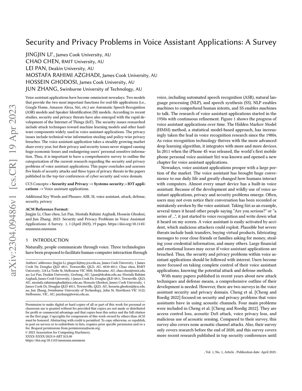 Voice assistant applications have become omniscient nowadays. Two models that provide the two most important functions for real-life applications (i.e., Google Home, Amazon Alexa, Siri, etc.) are Automatic Speech Recognition (ASR) models and Speaker Identification (SI) models. According to recent studies, security and privacy threats have also emerged with the rapid development of the Internet of Things (IoT). The security issues researched include attack techniques toward machine learning models and other hardware components widely used in voice assistant applications. The privacy issues include technical-wise information stealing and policy-wise privacy breaches. The voice assistant application takes a steadily growing market share every year, but their privacy and security issues never stopped causing huge economic losses and endangering users' personal sensitive information. Thus, it is important to have a comprehensive survey to outline the categorization of the current research regarding the security and privacy problems of voice assistant applications. This paper concludes and assesses five kinds of security attacks and three types of privacy threats in the papers published in the top-tier conferences of cyber security and voice domain.