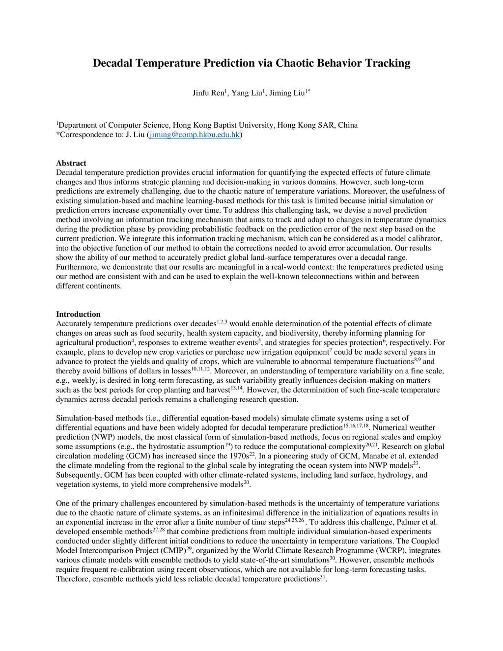 Decadal temperature prediction provides crucial information for quantifying the expected effects of future climate changes and thus informs strategic planning and decision-making in various domains. However, such long-term predictions are extremely challenging, due to the chaotic nature of temperature variations. Moreover, the usefulness of existing simulation-based and machine learning-based methods for this task is limited because initial simulation or prediction errors increase exponentially over time. To address this challenging task, we devise a novel prediction method involving an information tracking mechanism that aims to track and adapt to changes in temperature dynamics during the prediction phase by providing probabilistic feedback on the prediction error of the next step based on the current prediction. We integrate this information tracking mechanism, which can be considered as a model calibrator, into the objective function of our method to obtain the corrections needed to avoid error accumulation. Our results show the ability of our method to accurately predict global land-surface temperatures over a decadal range. Furthermore, we demonstrate that our results are meaningful in a real-world context: the temperatures predicted using our method are consistent with and can be used to explain the well-known teleconnections within and between different continents.