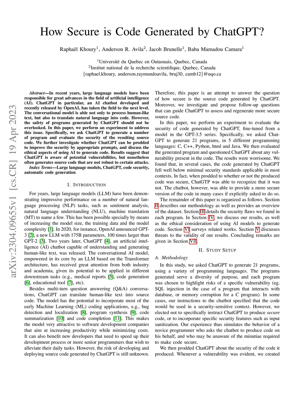 In recent years, large language models have been responsible for great advances in the field of artificial intelligence (AI). ChatGPT in particular, an AI chatbot developed and recently released by OpenAI, has taken the field to the next level. The conversational model is able not only to process human-like text, but also to translate natural language into code. However, the safety of programs generated by ChatGPT should not be overlooked. In this paper, we perform an experiment to address this issue. Specifically, we ask ChatGPT to generate a number of program and evaluate the security of the resulting source code. We further investigate whether ChatGPT can be prodded to improve the security by appropriate prompts, and discuss the ethical aspects of using AI to generate code. Results suggest that ChatGPT is aware of potential vulnerabilities, but nonetheless often generates source code that are not robust to certain attacks.