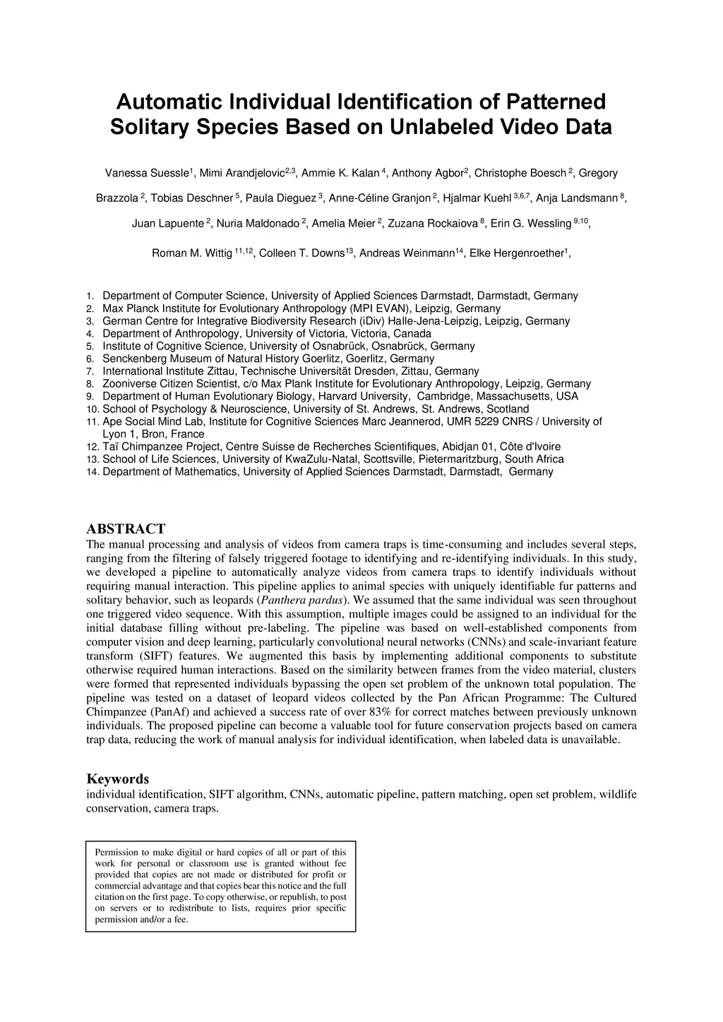 The manual processing and analysis of videos from camera traps is time-consuming and includes several steps, ranging from the filtering of falsely triggered footage to identifying and re-identifying individuals. In this study, we developed a pipeline to automatically analyze videos from camera traps to identify individuals without requiring manual interaction. This pipeline applies to animal species with uniquely identifiable fur patterns and solitary behavior, such as leopards (Panthera pardus). We assumed that the same individual was seen throughout one triggered video sequence. With this assumption, multiple images could be assigned to an individual for the initial database filling without pre-labeling. The pipeline was based on well-established components from computer vision and deep learning, particularly convolutional neural networks (CNNs) and scale-invariant feature transform (SIFT) features. We augmented this basis by implementing additional components to substitute otherwise required human interactions. Based on the similarity between frames from the video material, clusters were formed that represented individuals bypassing the open set problem of the unknown total population. The pipeline was tested on a dataset of leopard videos collected by the Pan African Programme: The Cultured Chimpanzee (PanAf) and achieved a success rate of over 83% for correct matches between previously unknown individuals. The proposed pipeline can become a valuable tool for future conservation projects based on camera trap data, reducing the work of manual analysis for individual identification, when labeled data is unavailable.