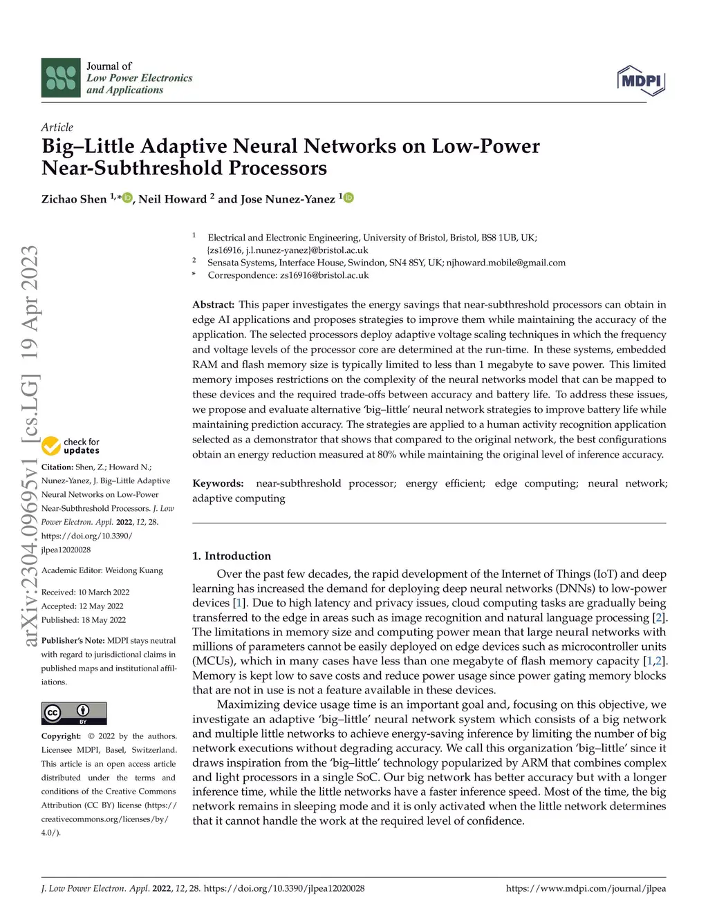 This paper investigates the energy savings that near-subthreshold processors can obtain in edge AI applications and proposes strategies to improve them while maintaining the accuracy of the application. The selected processors deploy adaptive voltage scaling techniques in which the frequency and voltage levels of the processor core are determined at the run-time. In these systems, embedded RAM and flash memory size is typically limited to less than 1 megabyte to save power. This limited memory imposes restrictions on the complexity of the neural networks model that can be mapped to these devices and the required trade-offs between accuracy and battery life. To address these issues, we propose and evaluate alternative 'big-little' neural network strategies to improve battery life while maintaining prediction accuracy. The strategies are applied to a human activity recognition application selected as a demonstrator that shows that compared to the original network, the best configurations obtain an energy reduction measured at 80% while maintaining the original level of inference accuracy.
