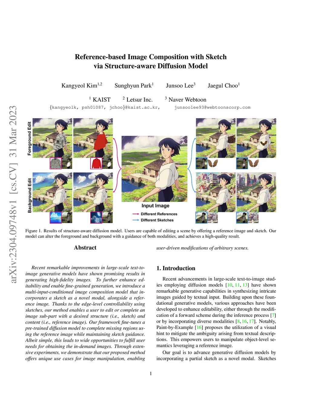 Recent remarkable improvements in large-scale text-to-image generative models have shown promising results in generating high-fidelity images. To further enhance editability and enable fine-grained generation, we introduce a multi-input-conditioned image composition model that incorporates a sketch as a novel modal, alongside a reference image. Thanks to the edge-level controllability using sketches, our method enables a user to edit or complete an image sub-part with a desired structure (i.e., sketch) and content (i.e., reference image). Our framework fine-tunes a pre-trained diffusion model to complete missing regions using the reference image while maintaining sketch guidance. Albeit simple, this leads to wide opportunities to fulfill user needs for obtaining the in-demand images. Through extensive experiments, we demonstrate that our proposed method offers unique use cases for image manipulation, enabling user-driven modifications of arbitrary scenes.
