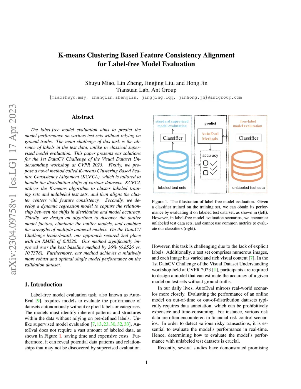 The label-free model evaluation aims to predict the model performance on various test sets without relying on ground truths. The main challenge of this task is the absence of labels in the test data, unlike in classical supervised model evaluation. This paper presents our solutions for the 1st DataCV Challenge of the Visual Dataset Understanding workshop at CVPR 2023. Firstly, we propose a novel method called K-means Clustering Based Feature Consistency Alignment (KCFCA), which is tailored to handle the distribution shifts of various datasets. KCFCA utilizes the K-means algorithm to cluster labeled training sets and unlabeled test sets, and then aligns the cluster centers with feature consistency. Secondly, we develop a dynamic regression model to capture the relationship between the shifts in distribution and model accuracy. Thirdly, we design an algorithm to discover the outlier model factors, eliminate the outlier models, and combine the strengths of multiple autoeval models. On the DataCV Challenge leaderboard, our approach secured 2nd place with an RMSE of 6.8526. Our method significantly improved over the best baseline method by 36\% (6.8526 vs. 10.7378). Furthermore, our method achieves a relatively more robust and optimal single model performance on the validation dataset.