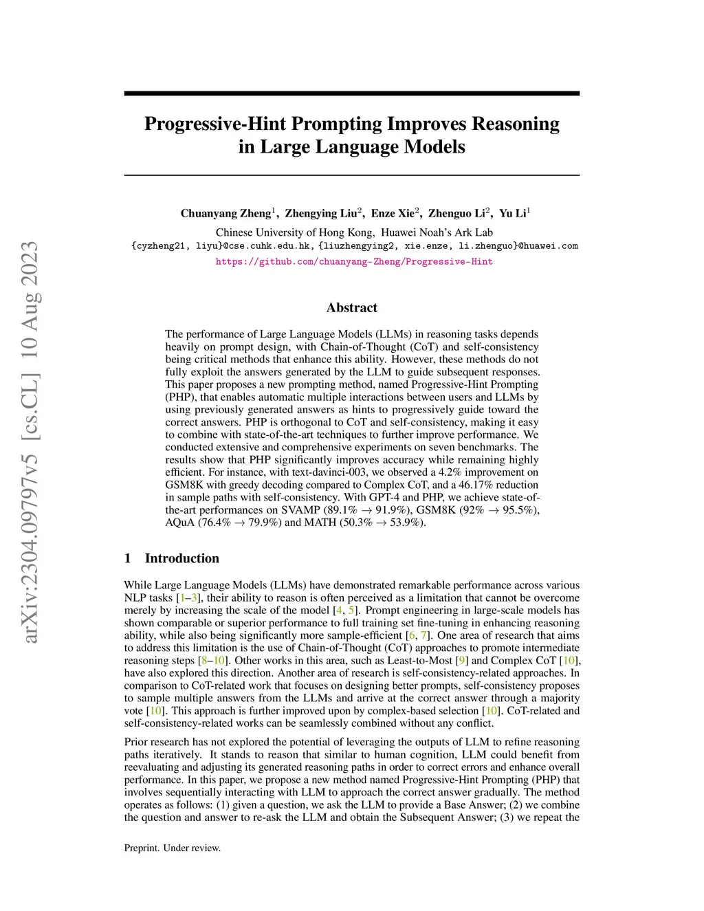 The performance of Large Language Models (LLMs) in reasoning tasks depends heavily on prompt design, with Chain-of-Thought (CoT) and self-consistency being critical methods that enhance this ability. However, these methods do not fully exploit the answers generated by the LLM to guide subsequent responses. This paper proposes a new prompting method, named Progressive-Hint Prompting (PHP), that enables automatic multiple interactions between users and LLMs by using previously generated answers as hints to progressively guide toward the correct answers. PHP is orthogonal to CoT and self-consistency, making it easy to combine with state-of-the-art techniques to further improve performance. We conducted extensive and comprehensive experiments on seven benchmarks. The results show that PHP significantly improves accuracy while remaining highly efficient. For instance, with text-davinci-003, we observed a 4.2% improvement on GSM8K with greedy decoding compared to Complex CoT, and a 46.17% reduction in sample paths with self-consistency. With GPT-4 and PHP, we achieve state-of-the-art performances on SVAMP (89.1% -> 91.9%), GSM8K (92% -> 95.5%), AQuA (76.4% -> 79.9%) and MATH (50.3% -> 53.9%).
