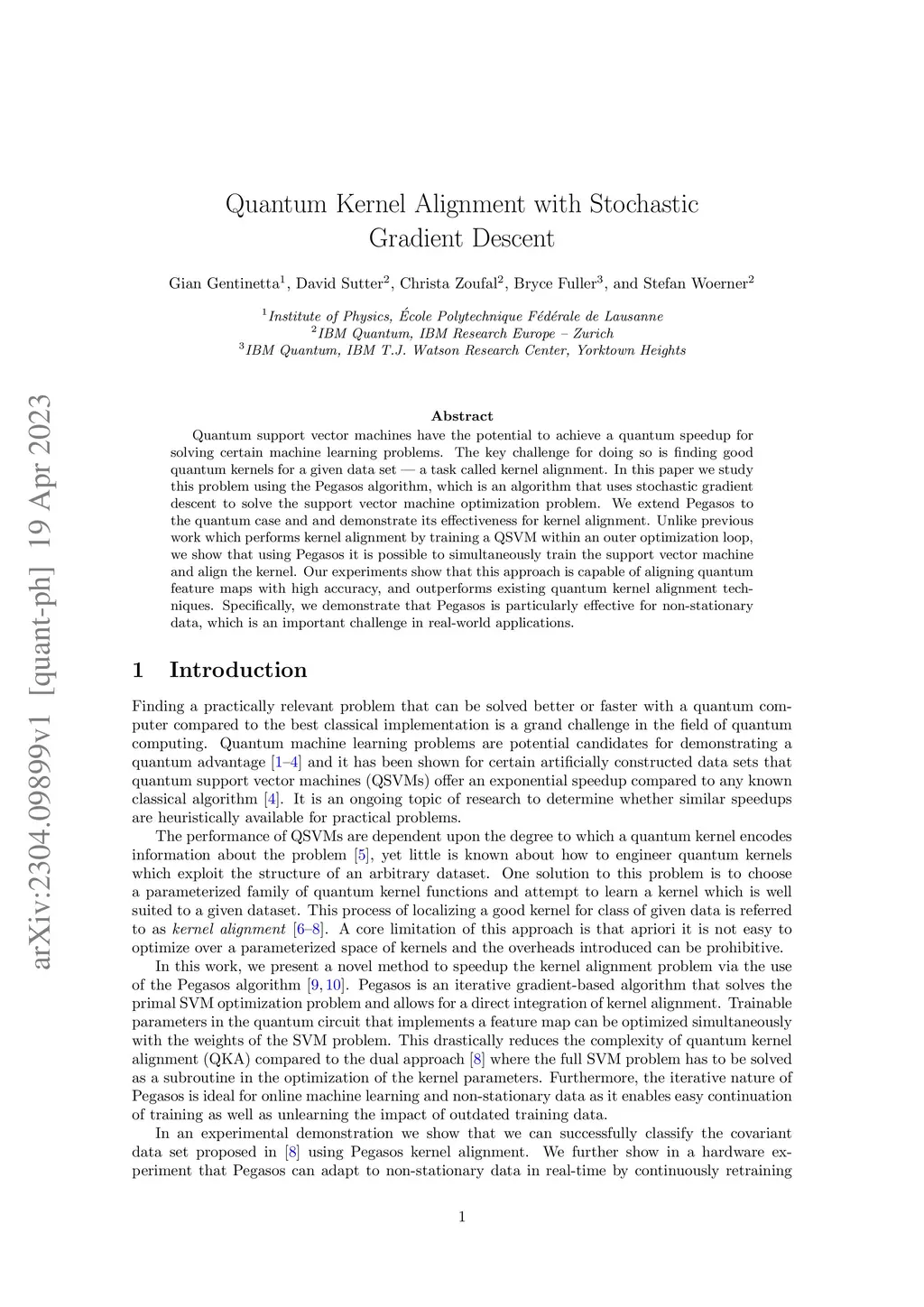 Quantum support vector machines have the potential to achieve a quantum speedup for solving certain machine learning problems. The key challenge for doing so is finding good quantum kernels for a given data set -- a task called kernel alignment. In this paper we study this problem using the Pegasos algorithm, which is an algorithm that uses stochastic gradient descent to solve the support vector machine optimization problem. We extend Pegasos to the quantum case and and demonstrate its effectiveness for kernel alignment. Unlike previous work which performs kernel alignment by training a QSVM within an outer optimization loop, we show that using Pegasos it is possible to simultaneously train the support vector machine and align the kernel. Our experiments show that this approach is capable of aligning quantum feature maps with high accuracy, and outperforms existing quantum kernel alignment techniques. Specifically, we demonstrate that Pegasos is particularly effective for non-stationary data, which is an important challenge in real-world applications.
