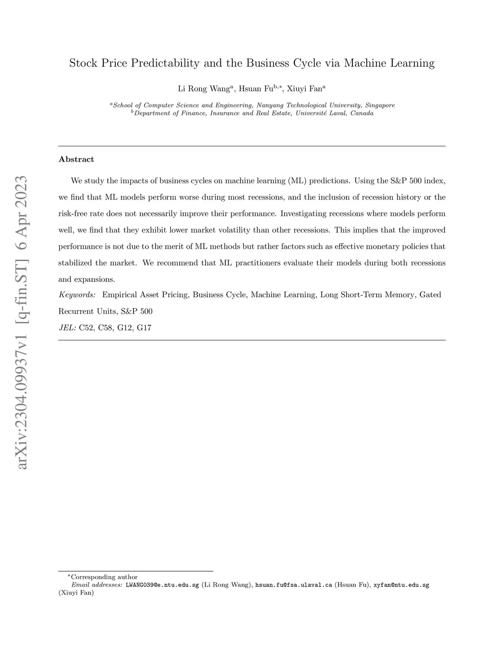 We study the impacts of business cycles on machine learning (ML) predictions. Using the S&P 500 index, we find that ML models perform worse during most recessions, and the inclusion of recession history or the risk-free rate does not necessarily improve their performance. Investigating recessions where models perform well, we find that they exhibit lower market volatility than other recessions. This implies that the improved performance is not due to the merit of ML methods but rather factors such as effective monetary policies that stabilized the market. We recommend that ML practitioners evaluate their models during both recessions and expansions.