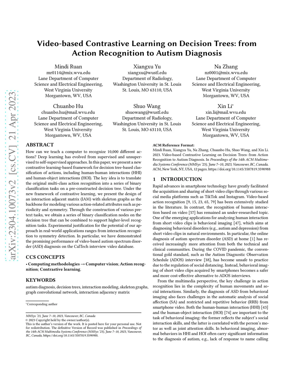 How can we teach a computer to recognize 10,000 different actions? Deep learning has evolved from supervised and unsupervised to self-supervised approaches. In this paper, we present a new contrastive learning-based framework for decision tree-based classification of actions, including human-human interactions (HHI) and human-object interactions (HOI). The key idea is to translate the original multi-class action recognition into a series of binary classification tasks on a pre-constructed decision tree. Under the new framework of contrastive learning, we present the design of an interaction adjacent matrix (IAM) with skeleton graphs as the backbone for modeling various action-related attributes such as periodicity and symmetry. Through the construction of various pretext tasks, we obtain a series of binary classification nodes on the decision tree that can be combined to support higher-level recognition tasks. Experimental justification for the potential of our approach in real-world applications ranges from interaction recognition to symmetry detection. In particular, we have demonstrated the promising performance of video-based autism spectrum disorder (ASD) diagnosis on the CalTech interview video database.