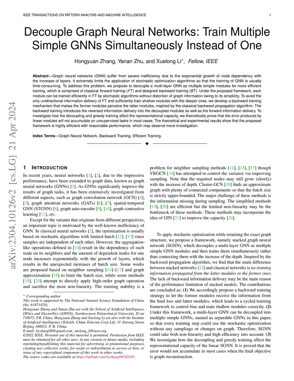 Graph neural networks (GNN) suffer from severe inefficiency. It is mainly caused by the exponential growth of node dependency with the increase of layers. It extremely limits the application of stochastic optimization algorithms so that the training of GNN is usually time-consuming. To address this problem, we propose to decouple a multi-layer GNN as multiple simple modules for more efficient training, which is comprised of classical forward training (FT)and designed backward training (BT). Under the proposed framework, each module can be trained efficiently in FT by stochastic algorithms without distortion of graph information owing to its simplicity. To avoid the only unidirectional information delivery of FT and sufficiently train shallow modules with the deeper ones, we develop a backward training mechanism that makes the former modules perceive the latter modules. The backward training introduces the reversed information delivery into the decoupled modules as well as the forward information delivery. To investigate how the decoupling and greedy training affect the representational capacity, we theoretically prove that the error produced by linear modules will not accumulate on unsupervised tasks in most cases. The theoretical and experimental results show that the proposed framework is highly efficient with reasonable performance.