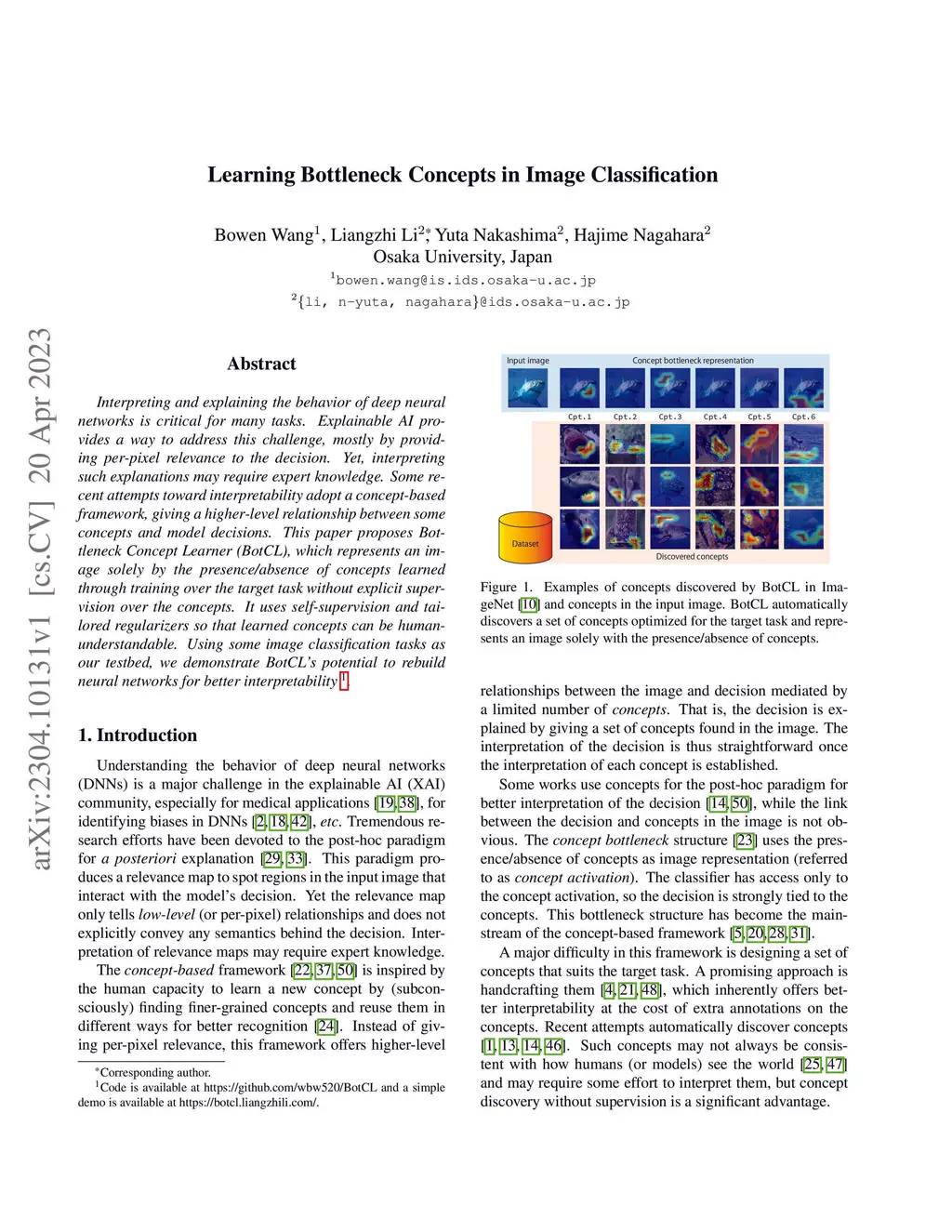 Interpreting and explaining the behavior of deep neural networks is critical for many tasks. Explainable AI provides a way to address this challenge, mostly by providing per-pixel relevance to the decision. Yet, interpreting such explanations may require expert knowledge. Some recent attempts toward interpretability adopt a concept-based framework, giving a higher-level relationship between some concepts and model decisions. This paper proposes Bottleneck Concept Learner (BotCL), which represents an image solely by the presence/absence of concepts learned through training over the target task without explicit supervision over the concepts. It uses self-supervision and tailored regularizers so that learned concepts can be human-understandable. Using some image classification tasks as our testbed, we demonstrate BotCL's potential to rebuild neural networks for better interpretability. Code is available at https://github.com/wbw520/BotCL and a simple demo is available at https://botcl.liangzhili.com/.
