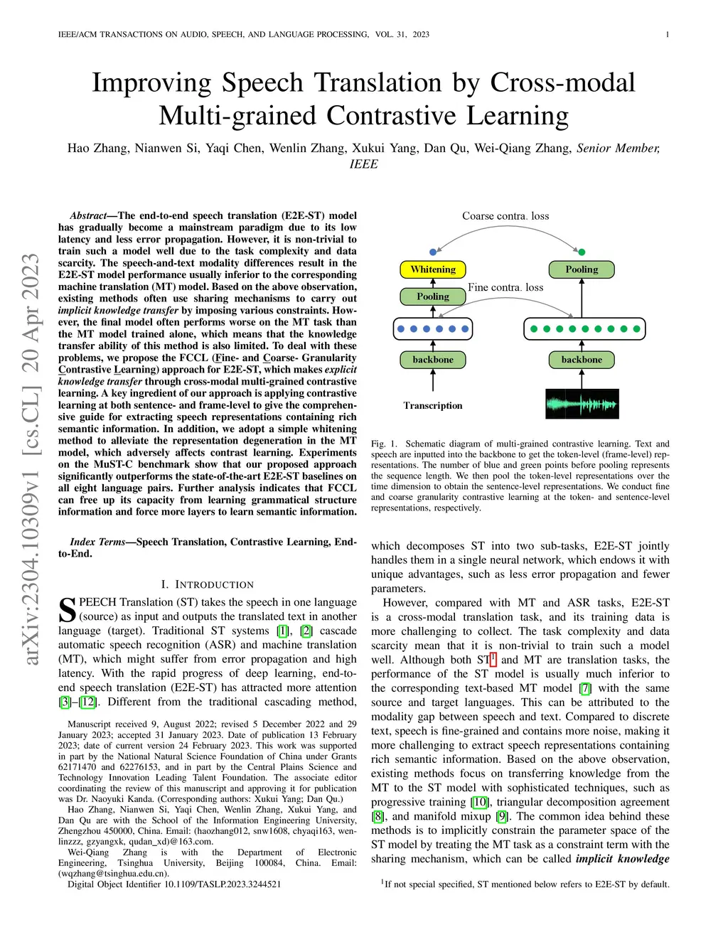 The end-to-end speech translation (E2E-ST) model has gradually become a mainstream paradigm due to its low latency and less error propagation. However, it is non-trivial to train such a model well due to the task complexity and data scarcity. The speech-and-text modality differences result in the E2E-ST model performance usually inferior to the corresponding machine translation (MT) model. Based on the above observation, existing methods often use sharingmechanisms to carry out implicit knowledge transfer by imposing various constraints. However, the final model often performs worse on the MT task than the MT model trained alone, which means that the knowledge transfer ability of this method is also limited. To deal with these problems, we propose the FCCL (Fine- and Coarse- Granularity Contrastive Learning) approach for E2E-ST, which makes explicit knowledge transfer through cross-modal multi-grained contrastive learning. A key ingredient of our approach is applying contrastive learning at both sentence- and frame-level to give the comprehensive guide for extracting speech representations containing rich semantic information.In addition, we adopt a simple whitening method to alleviate the representation degeneration in the MT model, which adversely affects contrast learning. Experiments on the MuST-C benchmark show that our proposed approach significantly outperforms the state-of-the-art E2E-ST baselines on all eight language pairs. Further analysis indicates that FCCL can free up its capacity from learning grammatical structure information and force more layers to learn semantic information.