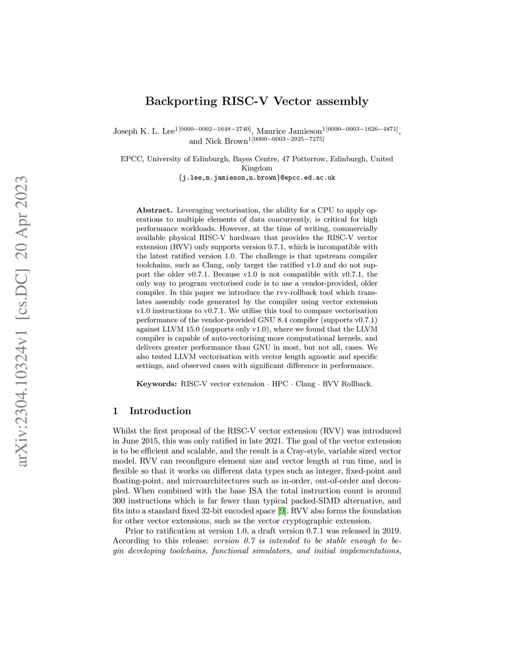 Leveraging vectorisation, the ability for a CPU to apply operations to multiple elements of data concurrently, is critical for high performance workloads. However, at the time of writing, commercially available physical RISC-V hardware that provides the RISC-V vector extension (RVV) only supports version 0.7.1, which is incompatible with the latest ratified version 1.0. The challenge is that upstream compiler toolchains, such as Clang, only target the ratified v1.0 and do not support the older v0.7.1. Because v1.0 is not compatible with v0.7.1, the only way to program vectorised code is to use a vendor-provided, older compiler. In this paper we introduce the rvv-rollback tool which translates assembly code generated by the compiler using vector extension v1.0 instructions to v0.7.1. We utilise this tool to compare vectorisation performance of the vendor-provided GNU 8.4 compiler (supports v0.7.1) against LLVM 15.0 (supports only v1.0), where we found that the LLVM compiler is capable of auto-vectorising more computational kernels, and delivers greater performance than GNU in most, but not all, cases. We also tested LLVM vectorisation with vector length agnostic and specific settings, and observed cases with significant difference in performance.