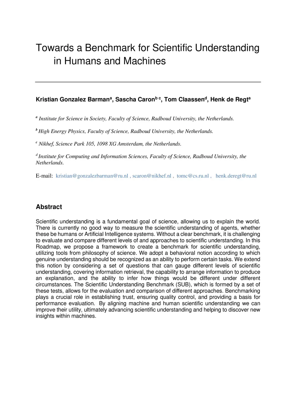 Scientific understanding is a fundamental goal of science, allowing us to explain the world. There is currently no good way to measure the scientific understanding of agents, whether these be humans or Artificial Intelligence systems. Without a clear benchmark, it is challenging to evaluate and compare different levels of and approaches to scientific understanding. In this Roadmap, we propose a framework to create a benchmark for scientific understanding, utilizing tools from philosophy of science. We adopt a behavioral notion according to which genuine understanding should be recognized as an ability to perform certain tasks. We extend this notion by considering a set of questions that can gauge different levels of scientific understanding, covering information retrieval, the capability to arrange information to produce an explanation, and the ability to infer how things would be different under different circumstances. The Scientific Understanding Benchmark (SUB), which is formed by a set of these tests, allows for the evaluation and comparison of different approaches. Benchmarking plays a crucial role in establishing trust, ensuring quality control, and providing a basis for performance evaluation. By aligning machine and human scientific understanding we can improve their utility, ultimately advancing scientific understanding and helping to discover new insights within machines.