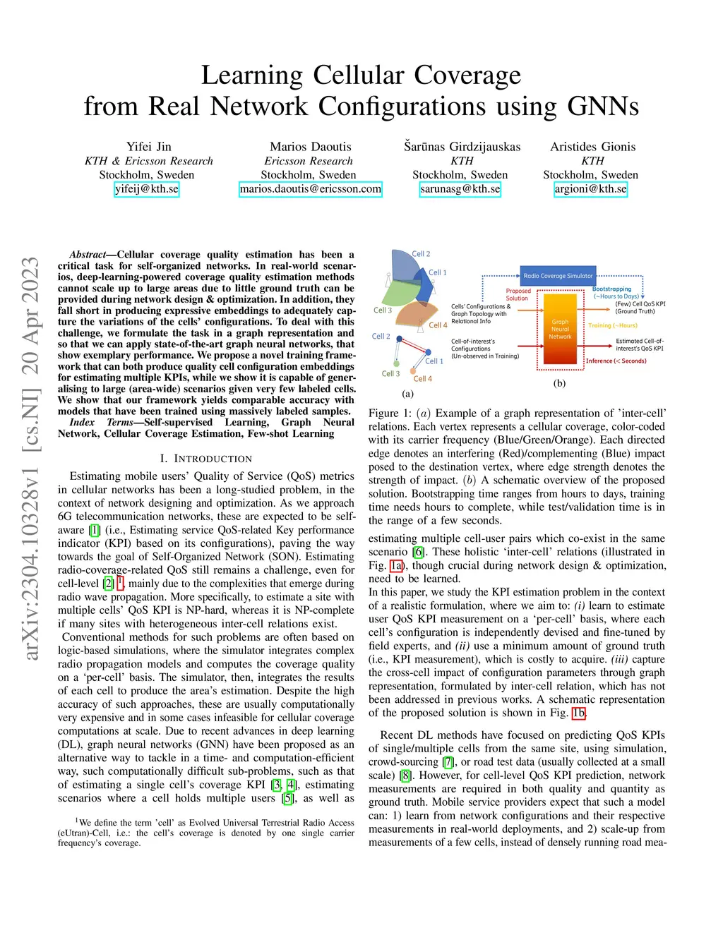 Cellular coverage quality estimation has been a critical task for self-organized networks. In real-world scenarios, deep-learning-powered coverage quality estimation methods cannot scale up to large areas due to little ground truth can be provided during network design & optimization. In addition they fall short in produce expressive embeddings to adequately capture the variations of the cells' configurations. To deal with this challenge, we formulate the task in a graph representation and so that we can apply state-of-the-art graph neural networks, that show exemplary performance. We propose a novel training framework that can both produce quality cell configuration embeddings for estimating multiple KPIs, while we show it is capable of generalising to large (area-wide) scenarios given very few labeled cells. We show that our framework yields comparable accuracy with models that have been trained using massively labeled samples.