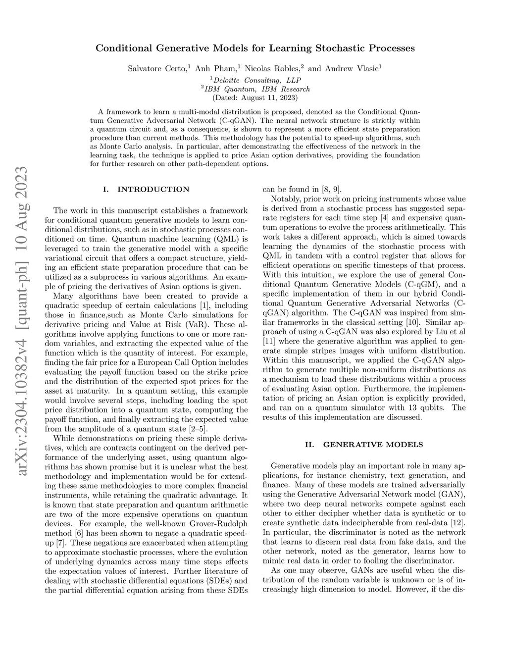 A framework to learn a multi-modal distribution is proposed, denoted as the Conditional Quantum Generative Adversarial Network (C-qGAN). The neural network structure is strictly within a quantum circuit and, as a consequence, is shown to represent a more efficient state preparation procedure than current methods. This methodology has the potential to speed-up algorithms, such as Monte Carlo analysis. In particular, after demonstrating the effectiveness of the network in the learning task, the technique is applied to price Asian option derivatives, providing the foundation for further research on other path-dependent options.