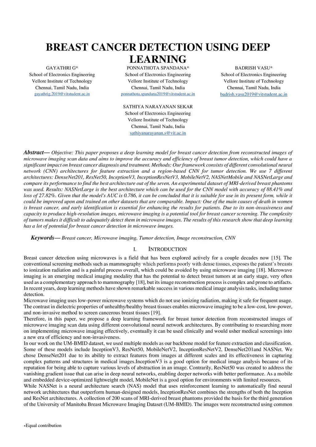 Objective: This paper proposes a deep learning model for breast cancer detection from reconstructed images of microwave imaging scan data and aims to improve the accuracy and efficiency of breast tumor detection, which could have a significant impact on breast cancer diagnosis and treatment. Methods: Our framework consists of different convolutional neural network (CNN) architectures for feature extraction and a region-based CNN for tumor detection. We use 7 different architectures: DenseNet201, ResNet50, InceptionV3, InceptionResNetV3, MobileNetV2, NASNetMobile and NASNetLarge and compare its performance to find the best architecture out of the seven. An experimental dataset of MRI-derived breast phantoms was used. Results: NASNetLarge is the best architecture which can be used for the CNN model with accuracy of 88.41% and loss of 27.82%. Given that the model's AUC is 0.786, it can be concluded that it is suitable for use in its present form, while it could be improved upon and trained on other datasets that are comparable. Impact: One of the main causes of death in women is breast cancer, and early identification is essential for enhancing the results for patients. Due to its non-invasiveness and capacity to produce high-resolution images, microwave imaging is a potential tool for breast cancer screening. The complexity of tumors makes it difficult to adequately detect them in microwave images. The results of this research show that deep learning has a lot of potential for breast cancer detection in microwave images