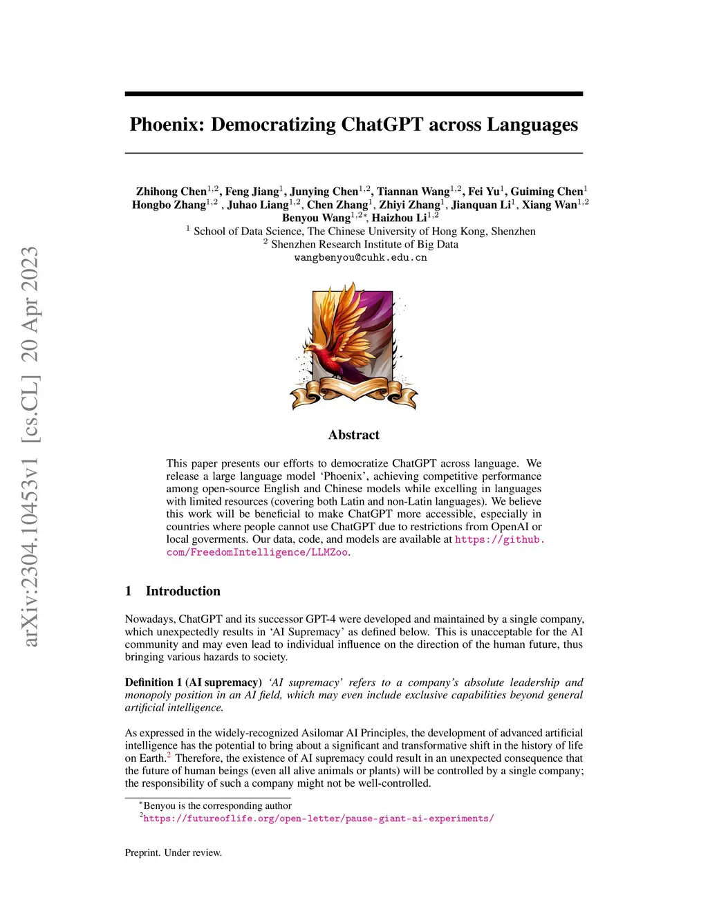 This paper presents our efforts to democratize ChatGPT across language. We release a large language model "Phoenix", achieving competitive performance among open-source English and Chinese models while excelling in languages with limited resources (covering both Latin and non-Latin languages). We believe this work will be beneficial to make ChatGPT more accessible, especially in countries where people cannot use ChatGPT due to restrictions from OpenAI or local goverments. Our data, code, and models are available at https://github.com/FreedomIntelligence/LLMZoo.
