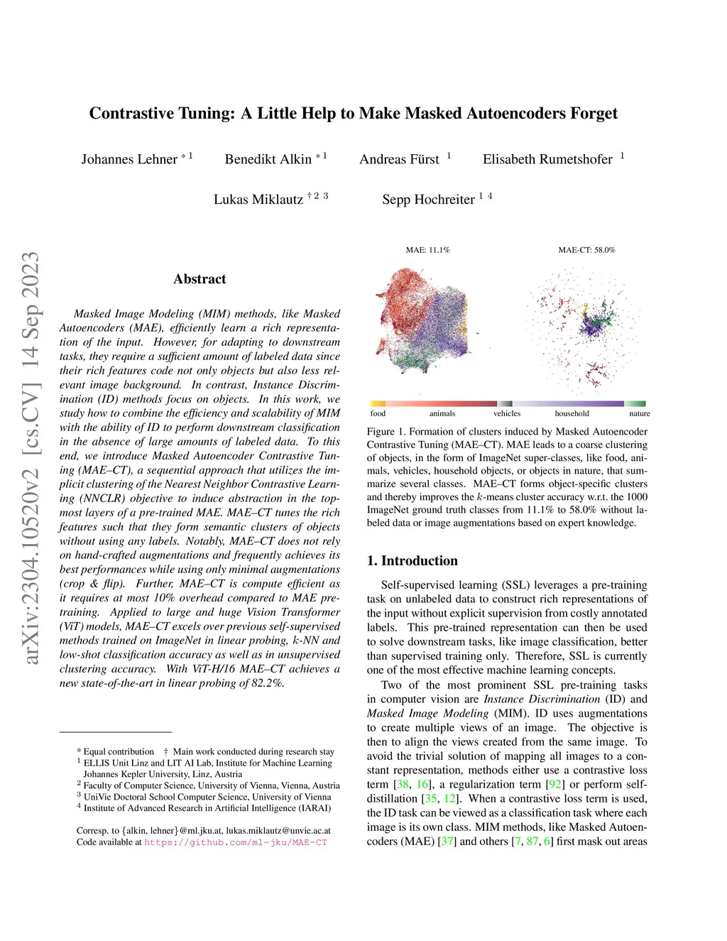 Masked Image Modeling (MIM) methods, like Masked Autoencoders (MAE), efficiently learn a rich representation of the input. However, for adapting to downstream tasks, they require a sufficient amount of labeled data since their rich features code not only objects but also less relevant image background. In contrast, Instance Discrimination (ID) methods focus on objects. In this work, we study how to combine the efficiency and scalability of MIM with the ability of ID to perform downstream classification in the absence of large amounts of labeled data. To this end, we introduce Masked Autoencoder Contrastive Tuning (MAE-CT), a sequential approach that utilizes the implicit clustering of the Nearest Neighbor Contrastive Learning (NNCLR) objective to induce abstraction in the topmost layers of a pre-trained MAE. MAE-CT tunes the rich features such that they form semantic clusters of objects without using any labels. Notably, MAE-CT does not rely on hand-crafted augmentations and frequently achieves its best performances while using only minimal augmentations (crop & flip). Further, MAE-CT is compute efficient as it requires at most 10% overhead compared to MAE re-training. Applied to large and huge Vision Transformer (ViT) models, MAE-CT excels over previous self-supervised methods trained on ImageNet in linear probing, k-NN and low-shot classification accuracy as well as in unsupervised clustering accuracy. With ViT-H/16 MAE-CT achieves a new state-of-the-art in linear probing of 82.2%.